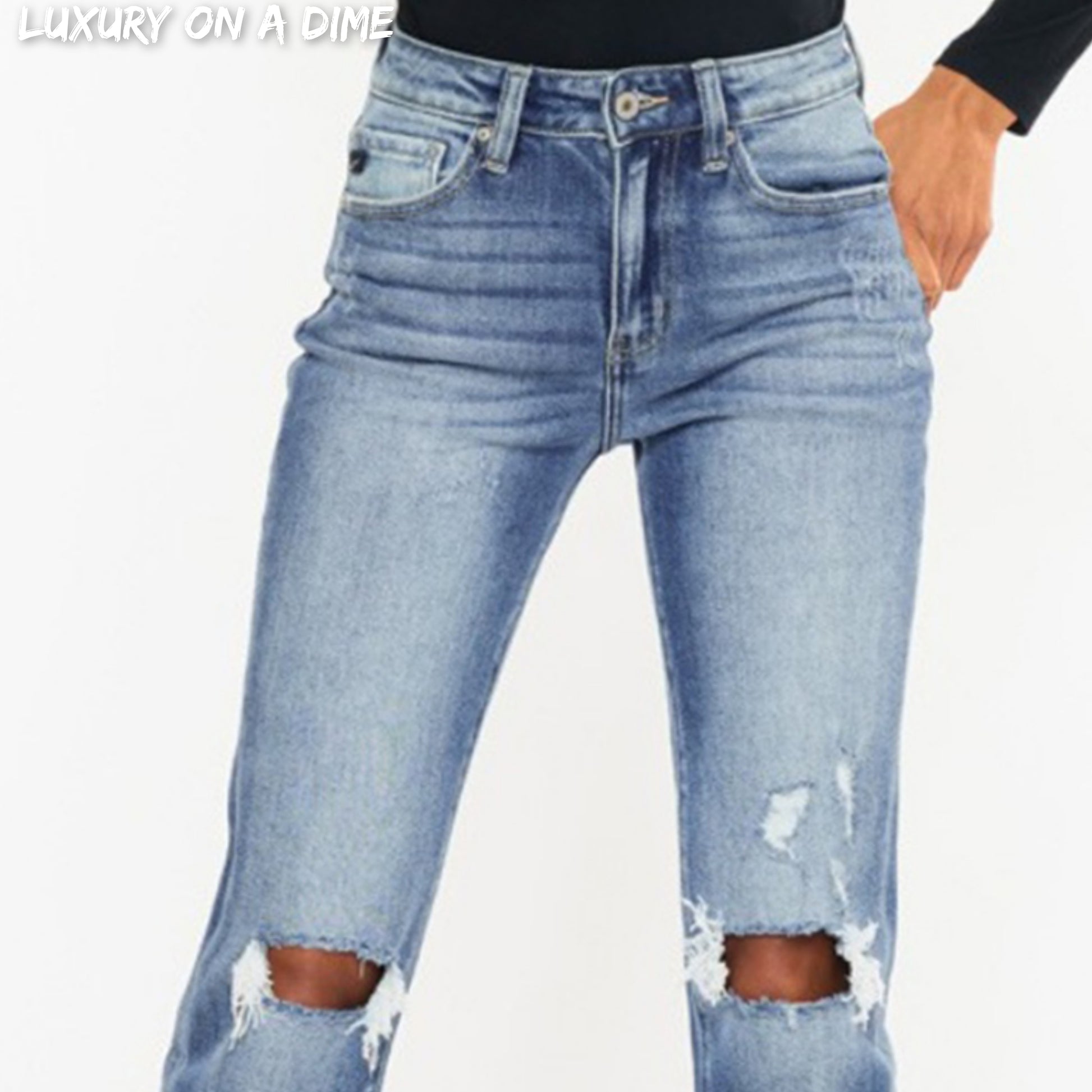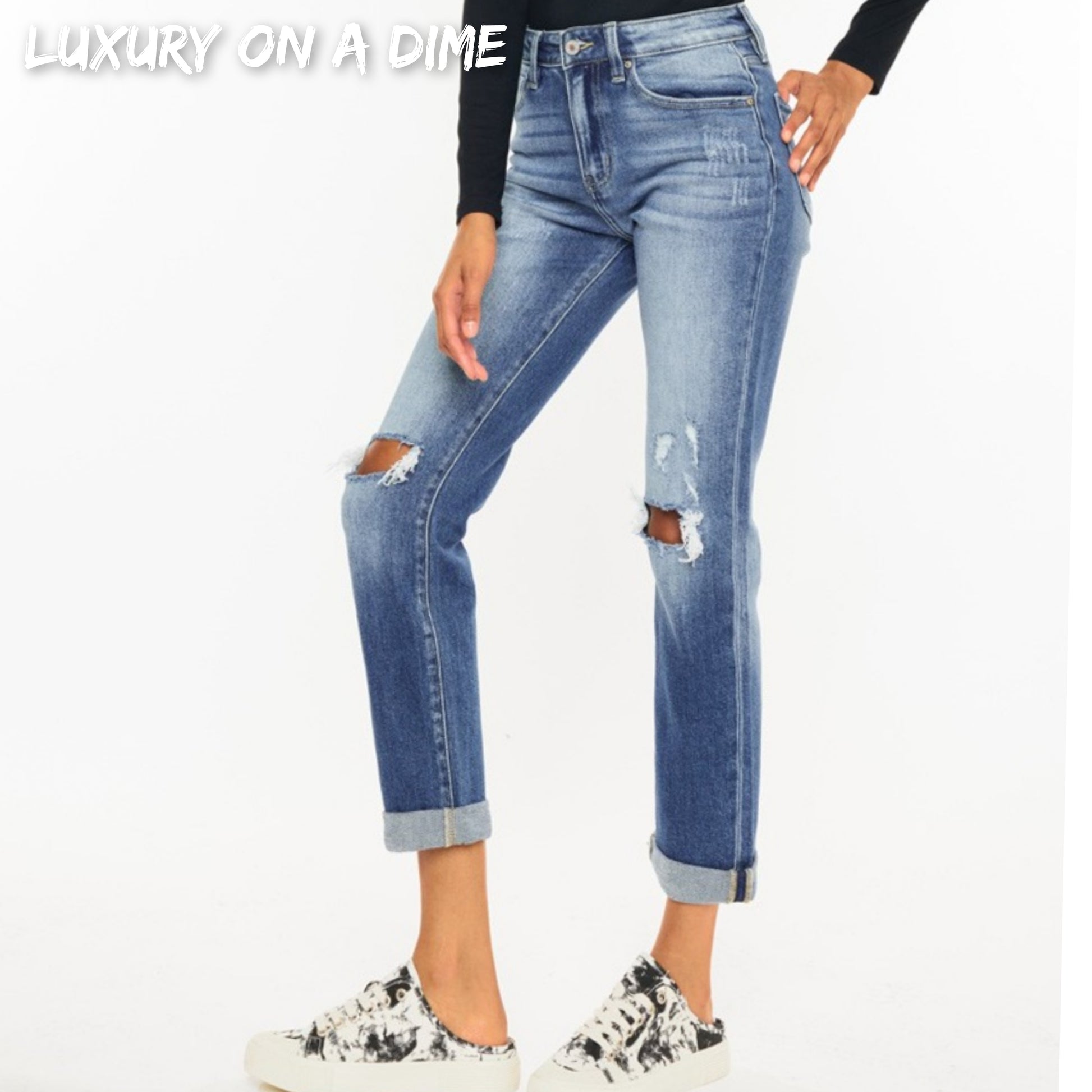 KanCan High-Rise Waist Distressed Denim Cuff Cropped Hem Straight Leg Jean Pants
