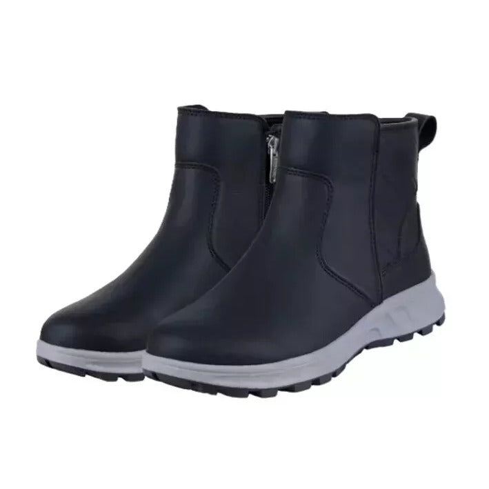 These all-weather ankle boots are made to brave the elements with stylish ease. With water-repellent faux leather and fully lined in plush faux fur, they keep your feet warm and dry even in snow, sleet, and rain. Thick, treaded rubber outsole grips in icy conditions, while the cushioned memory foam insole adds comfort. Quilted stitching at the heel and a contrast white midsole lend a modern touch to the rugged silhouette. With a sleek side-zip entry and weather rating down to -20°F, these boots are built for winter utility without sacrificing looks. Good for chilly commutes, après-ski wear, or any cold-weather outing. They complement gorpcore, commuter wear, and casual aesthetics.