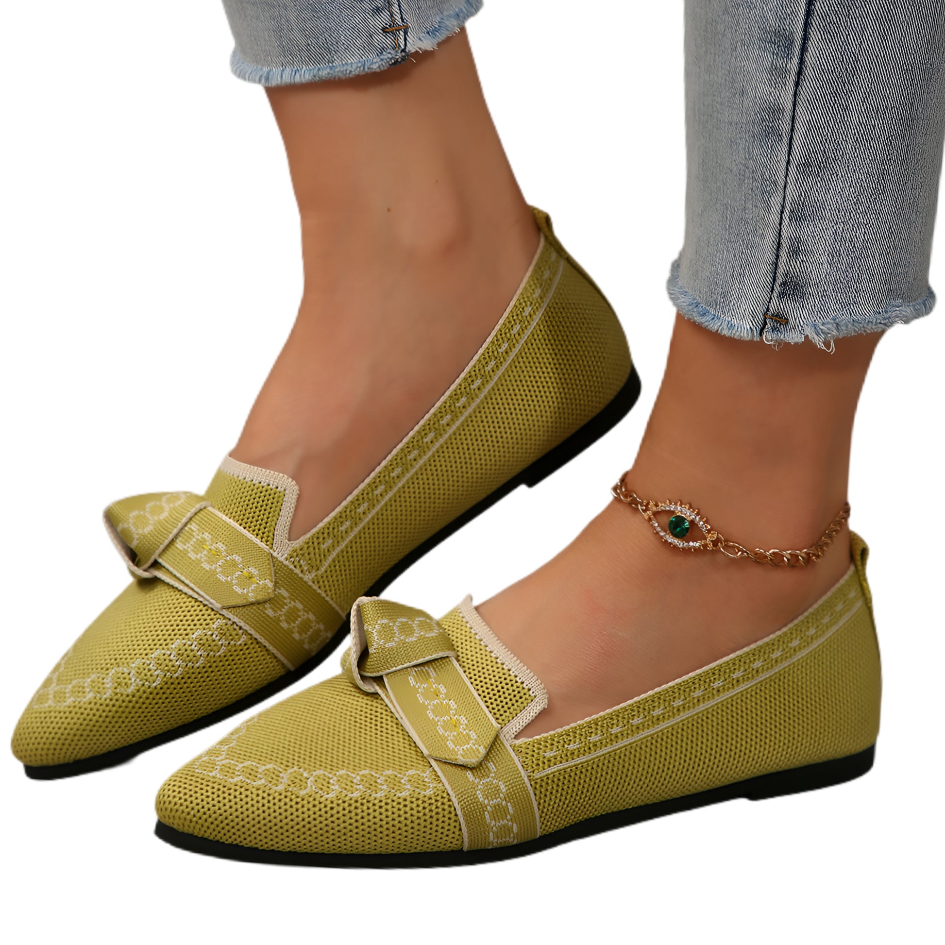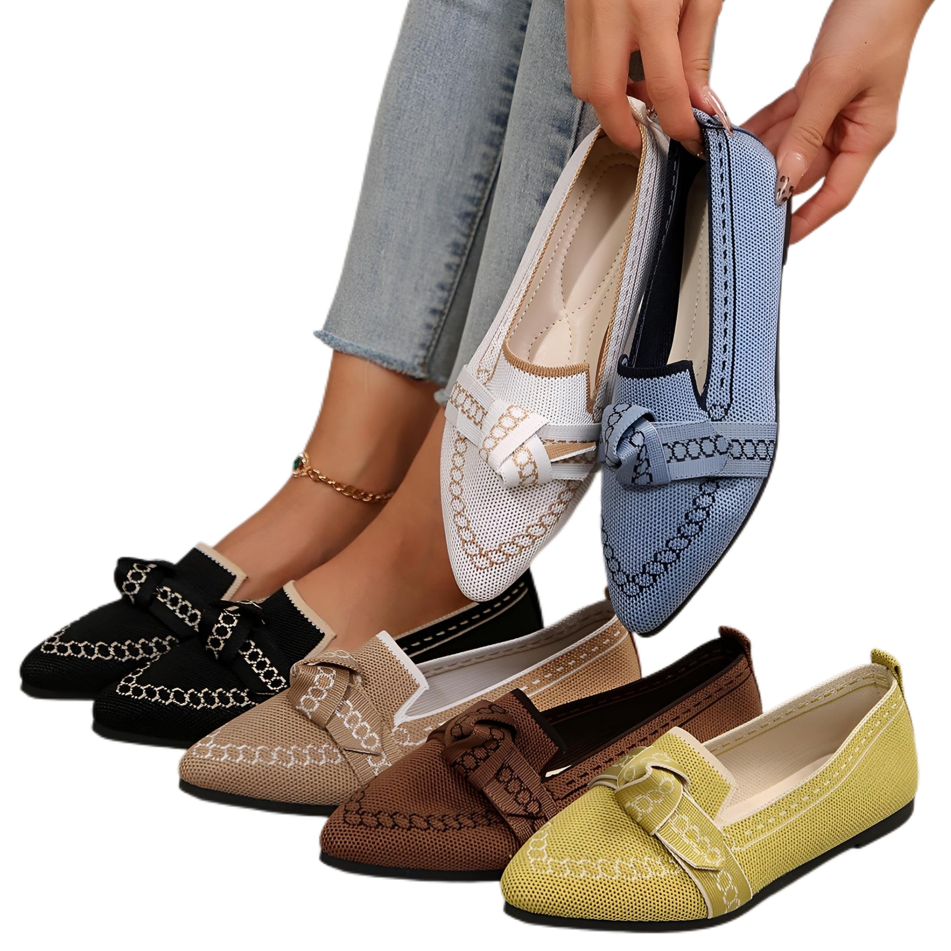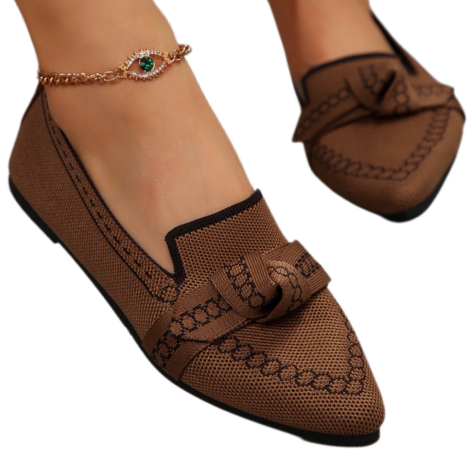 Blending timeless sophistication with modern ease, these woven loafers are designed to elevate any wardrobe with chic versatility. The pointed toe silhouette elongates the foot for a sleek, elegant profile, while the woven texture and color contrasting intricate stitching adds an artisanal touch. A decorative knotted strap across the vamp enhances the refined aesthetic, striking the perfect balance between classic and contemporary. Crafted with a soft, breathable upper, cushioned insole, and flexible sole, these slip-ons provide day-long comfort without sacrificing style. Easy to dress up or down, they embody a quiet luxury appeal ideal for workwear minimalism, Parisian chic, or polished preppy aesthetics. Whether paired with tailored trousers, jeans, or flowing skirts, these flats deliver a graceful finish for any occasion.