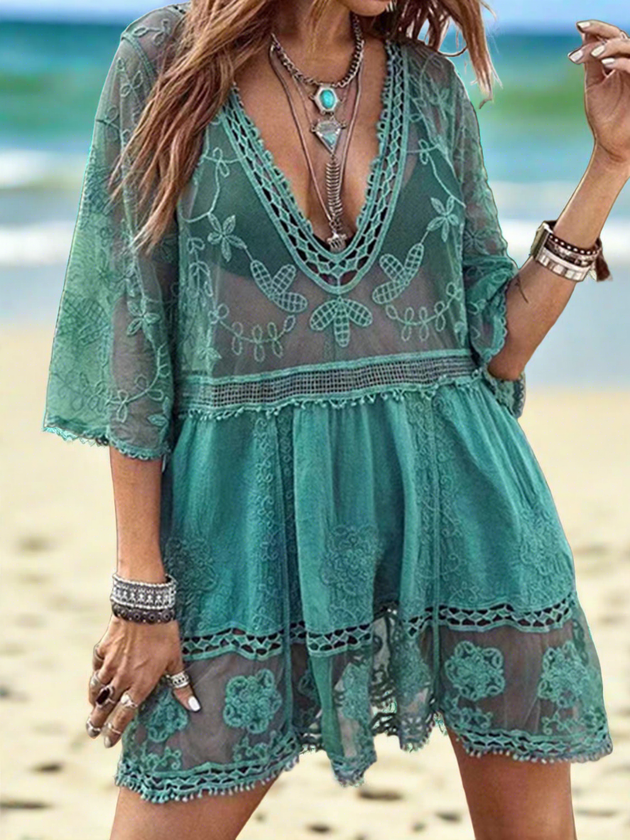 Lace Bohemian Oversized Swim Coverup Mini Dress Half-Sleeve Swimwear Cover