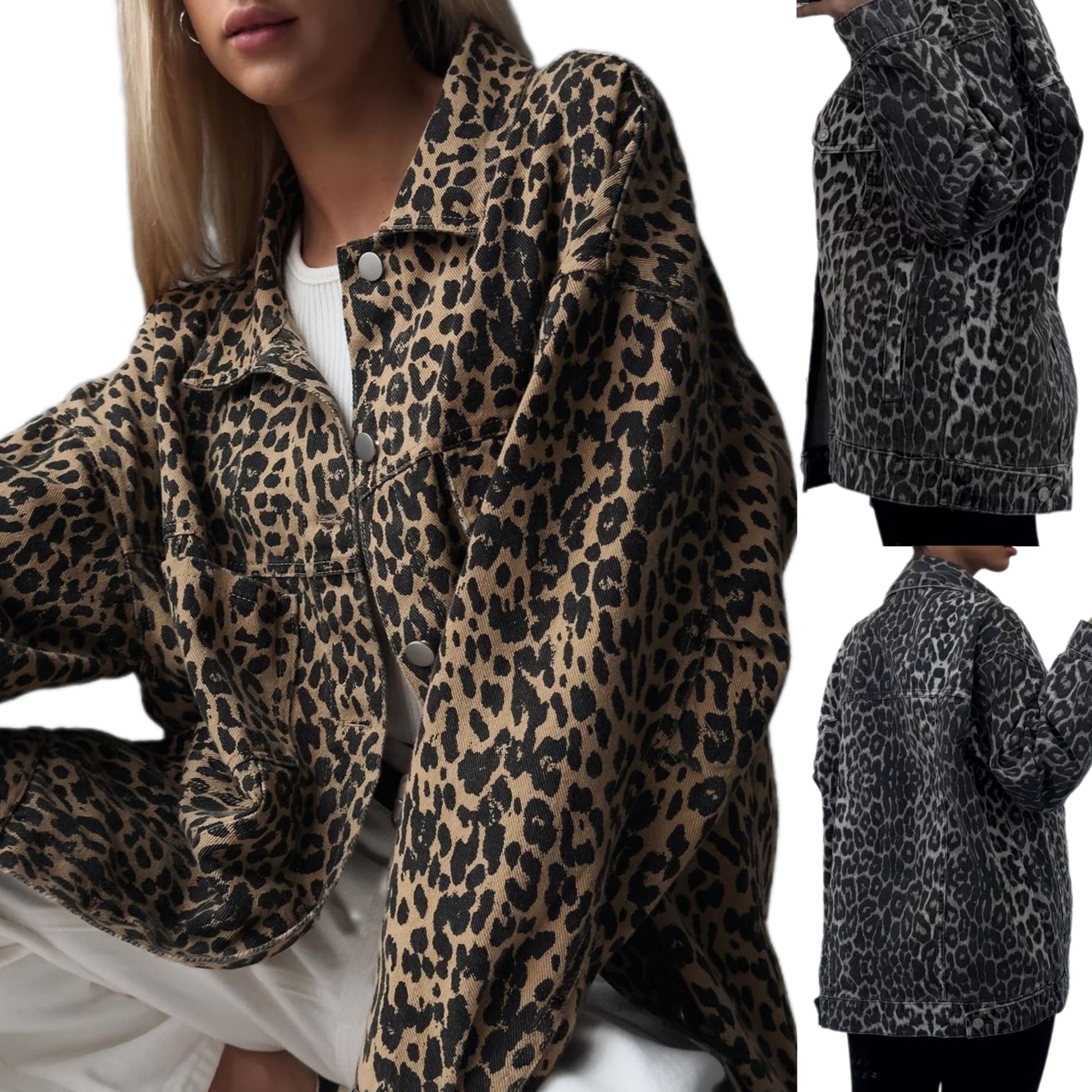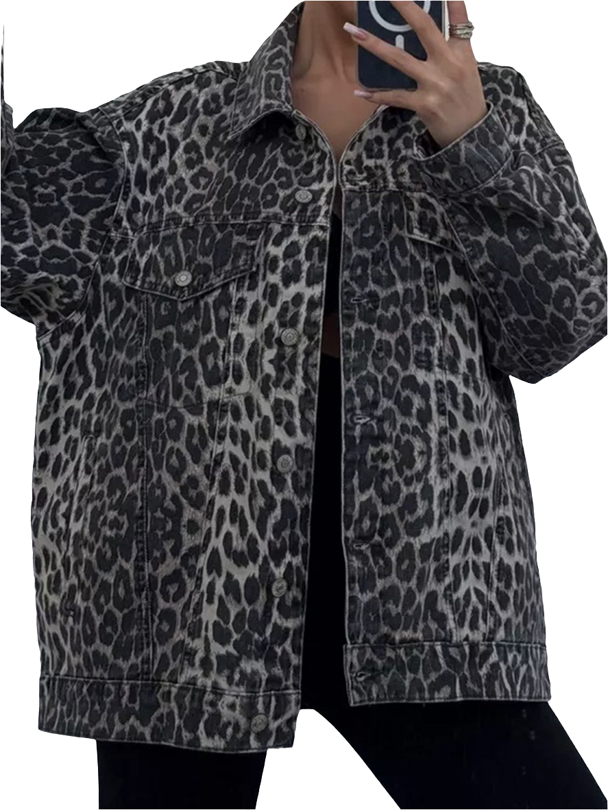 Oversized Leopard Animal Cotton Denim Jacket Collared Boyfriend Jean Shacket