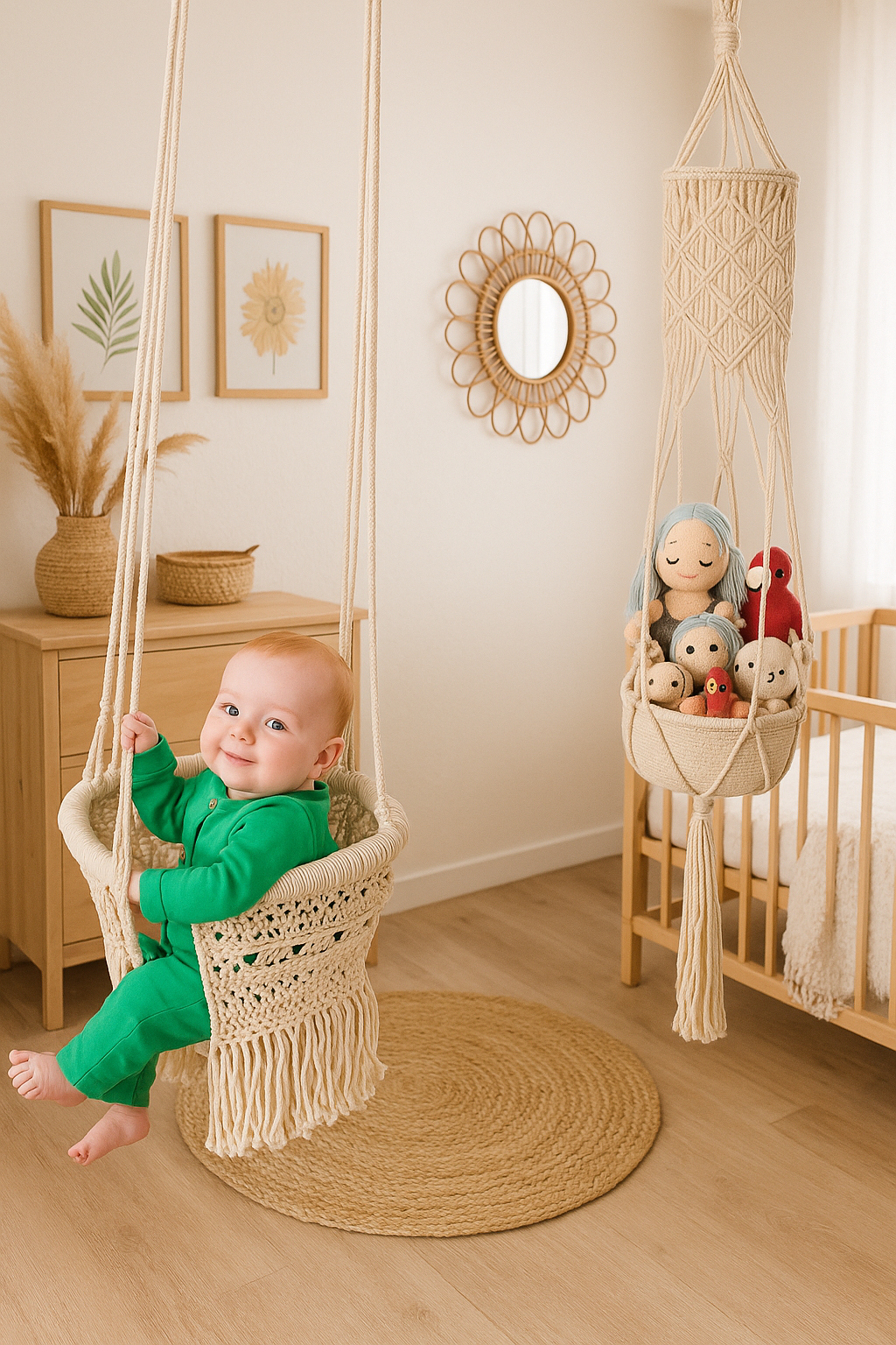 Create cherished moments with this organic macrame baby swing—the perfect bohemian nursery decor piece and a must-have for modern, eco-conscious parents!