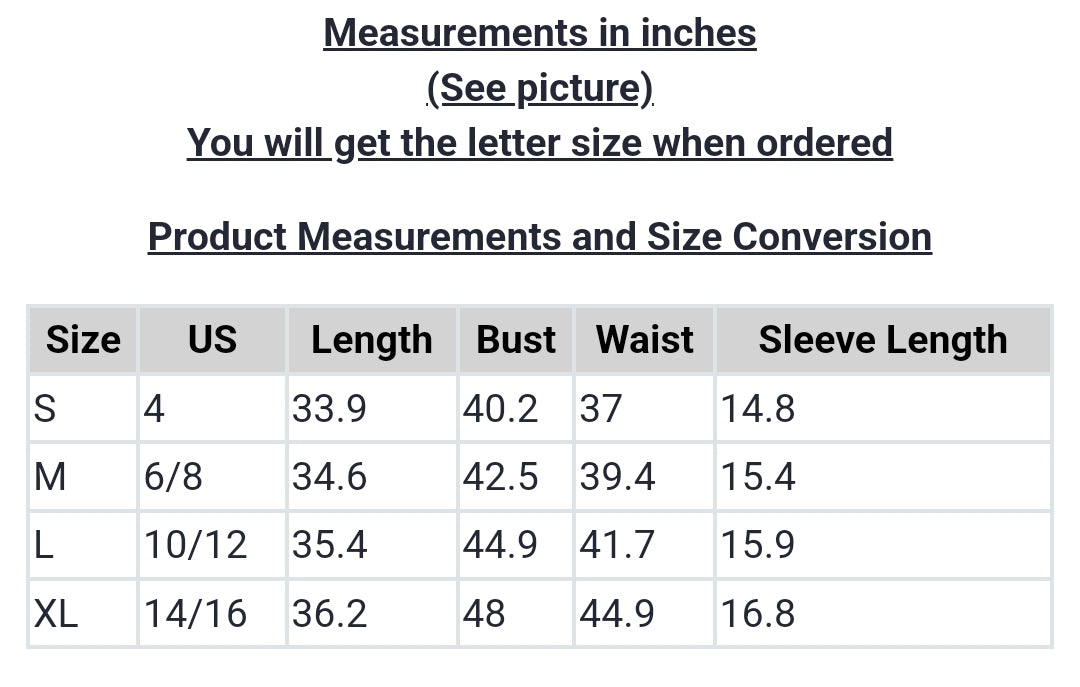 | Size | US | Length | Bust | Waist | Sleeve Length |