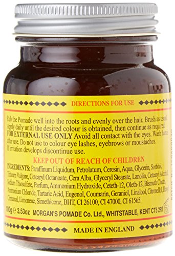 The World's famous Pomade. The classic solution to grey and ageing hair, tried and tested since 1873. Gradually darkens grey hair over a period of three to four weeks without the use of conventional dyes. Regular use of Morgan's Pomade enables the user to achieve a suitable hair color shade over a short period of time which can be maintained by subsequent, less frequent, applications. Enriched with Wheat Germ Oil - contains Vitamin E. Suitable for normal, thick dry, curly and brittle hair.