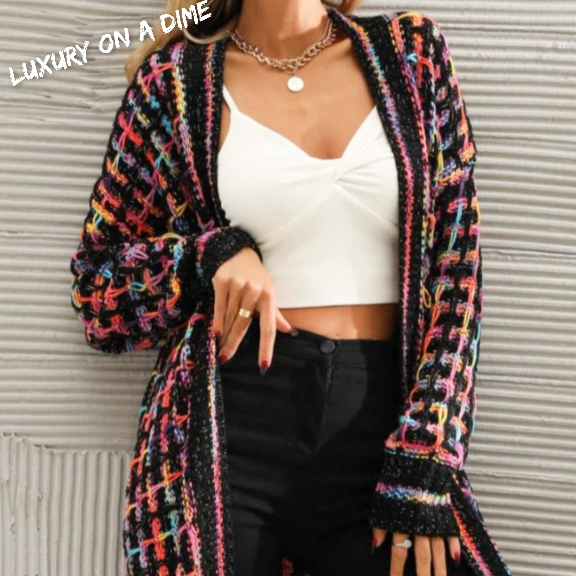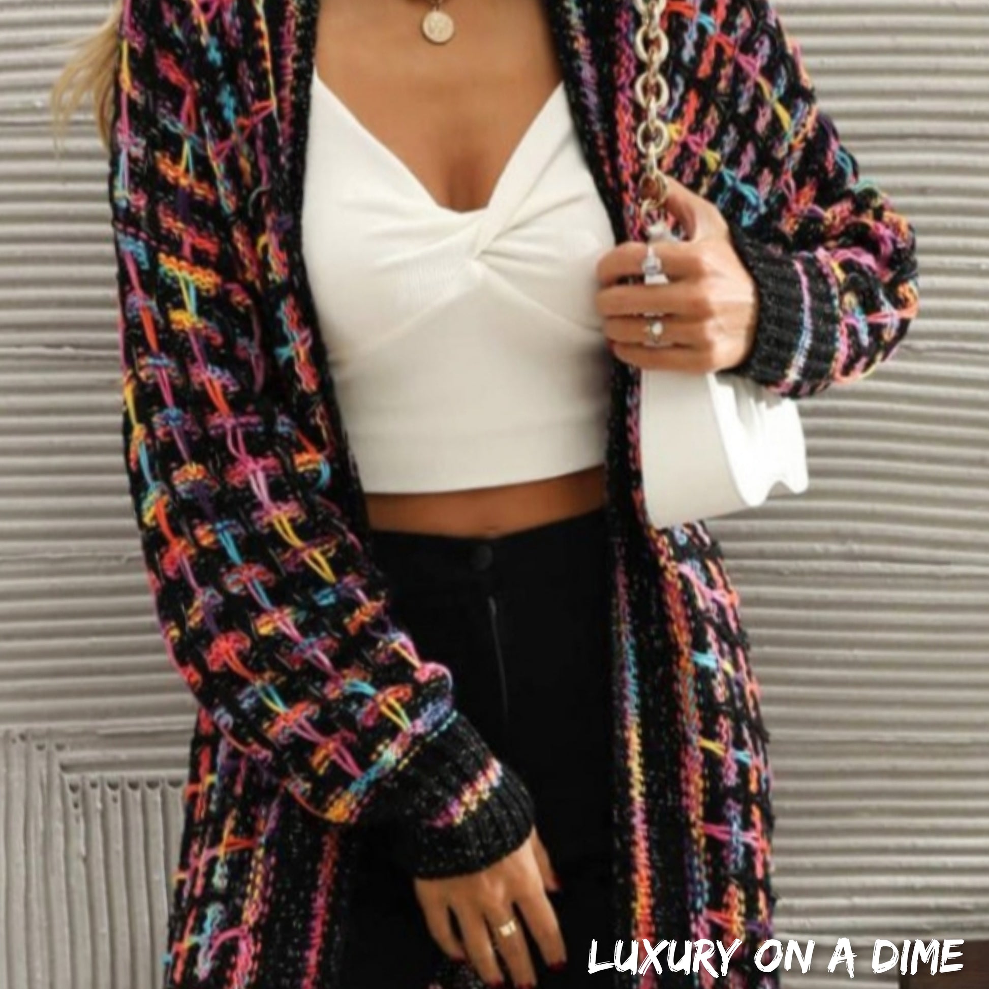 Retro Knit Bold Colorful Fringe Hem Longline Duster Sweater Cardigan