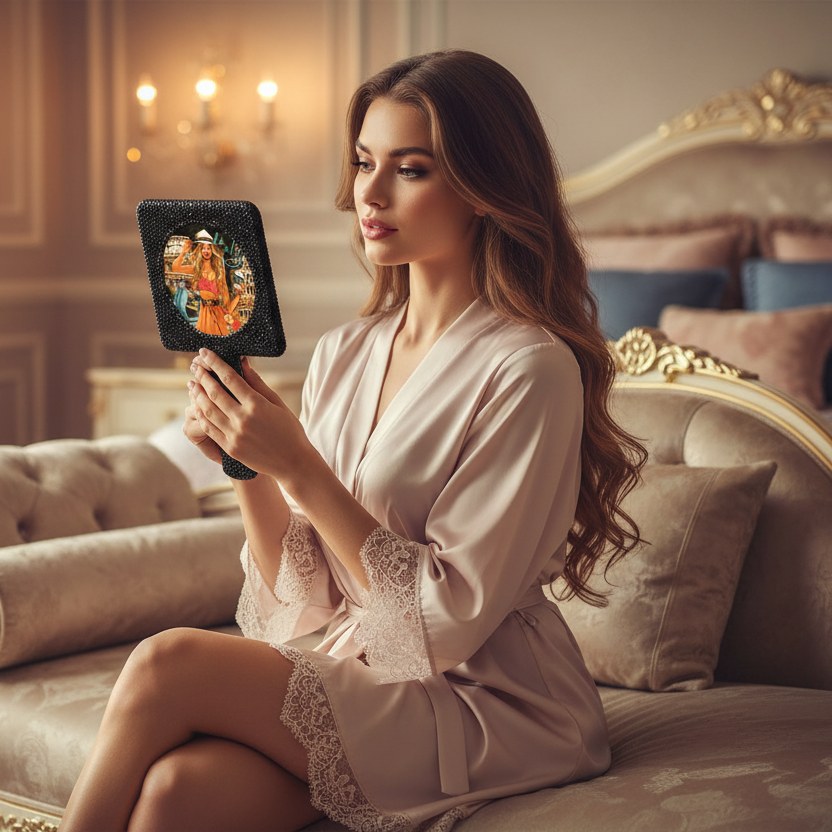 This handheld mirror presents a bold circular silhouette that brings a glamorous statement to your accessory. Adding a dramatic pop to classic vanity essentials and vintage-inspired beauty tool. The fully embellished frame and handle create a textured, light-catching surface that aligns with Y2K and luxury-inspired style. Offering a dramatic sparkle effect from every angle. The round mirror face and dense rhinestone detailing introduces a high-impact finish that adds a evening-ready addition to your purse for a quick makeup check. The sleek black base beneath the embellishment supports contrast and depth, modern glam appeal without overpowering the overall structure. Designed for both functional use and decorative display, this mirror blends practical beauty utility that offers a easy item for travelers. The combination of classic form and dazzling surface detail creates a balanced expression of mobwife glamour statement and everyday vanity elegance.