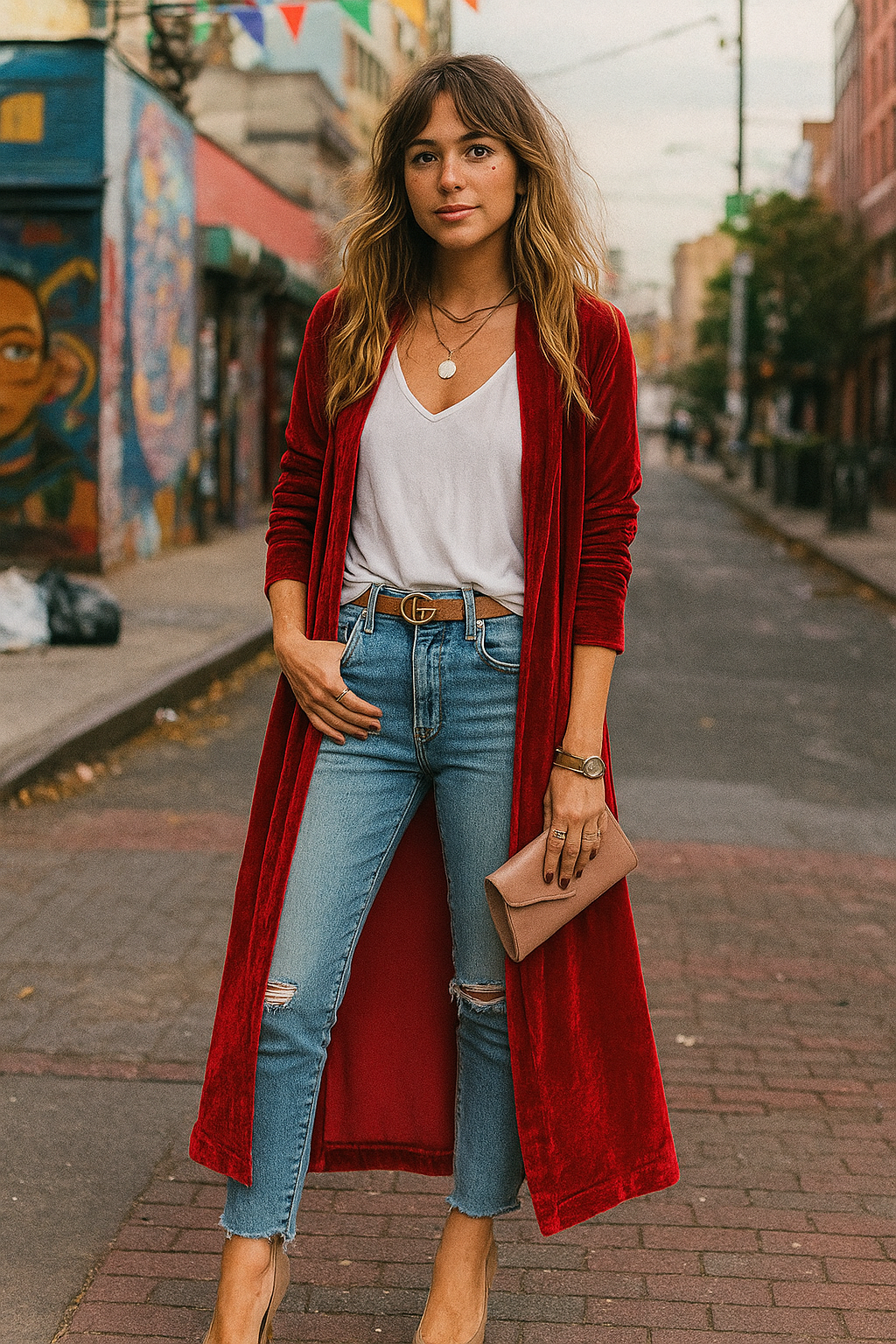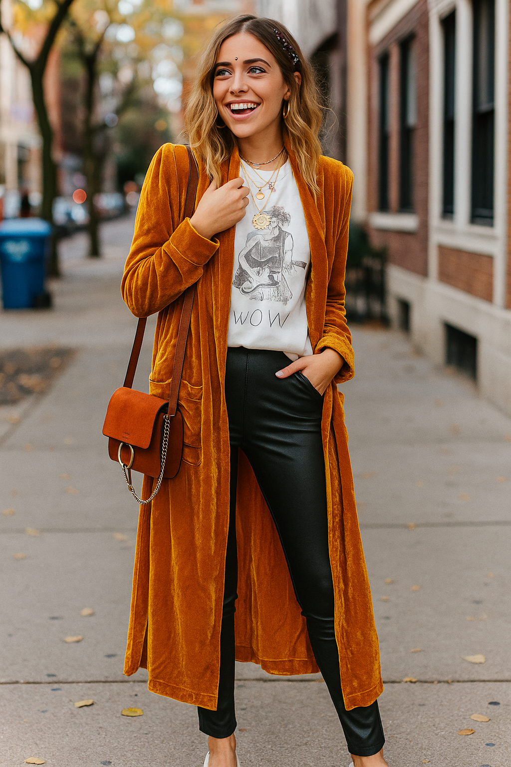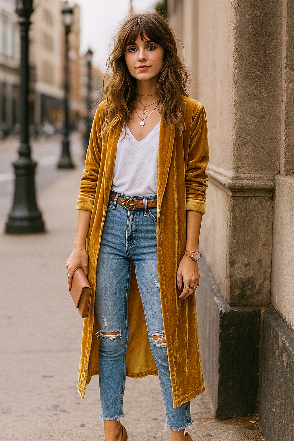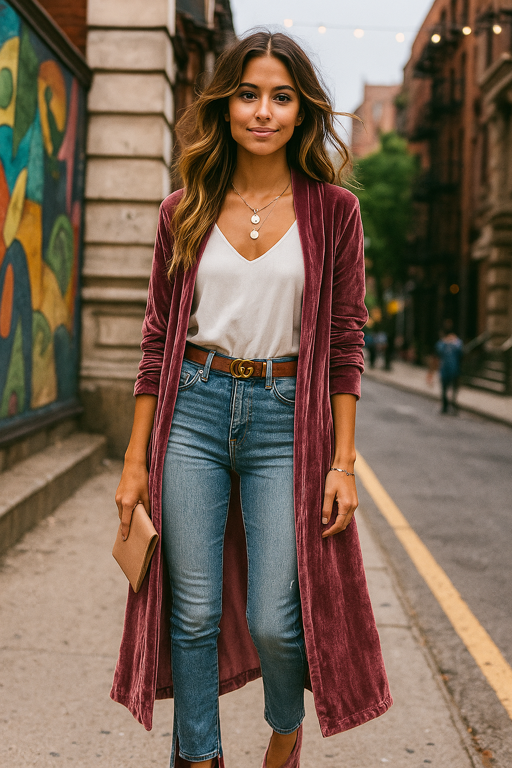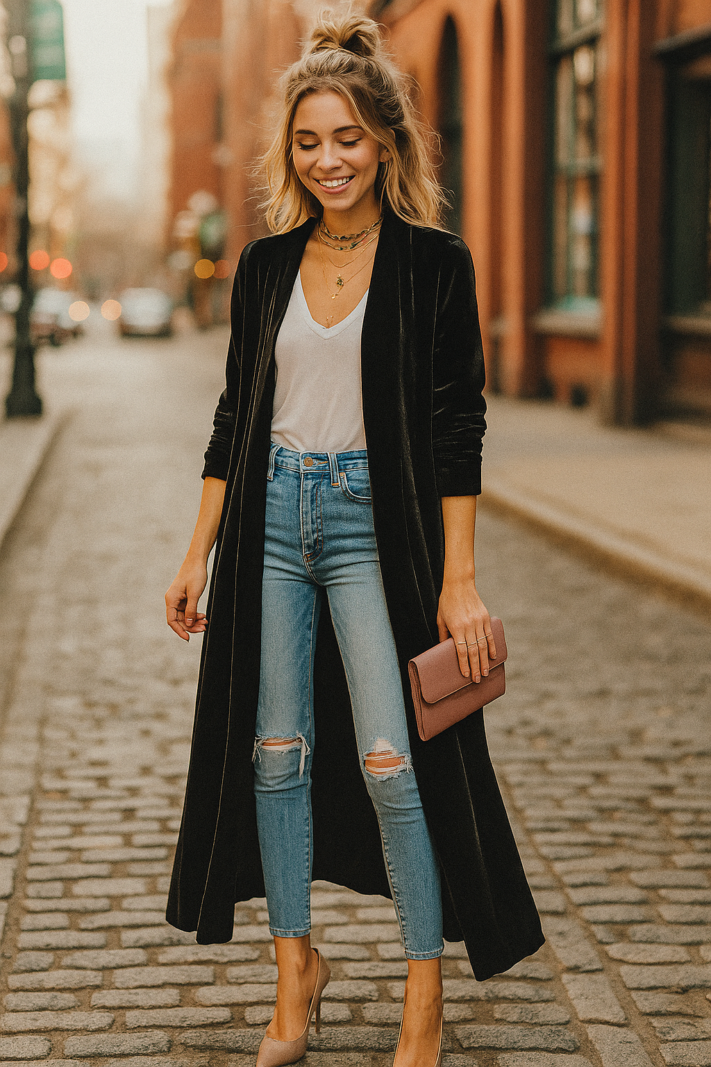 Step into timeless vintage-inspired style with this luxurious velour longline cardigan. Designed with a rich sheen and soft drape, it flows effortlessly with every movement, giving it an elegant yet relaxed aesthetic. The open front silhouette offers versatility, making it perfect for layering over casual outfits or dressing up for a chic evening look. Its duster length adds drama and the split hem brings a touch of sophistication. Open patch pockets for all of your essentials. While the plush texture channels a retro glam vibe reminiscent of 70s bohemian and disco glam influences. With its comfortable stretch and lightweight feel, this piece effortlessly blends statement style with everyday wearability.