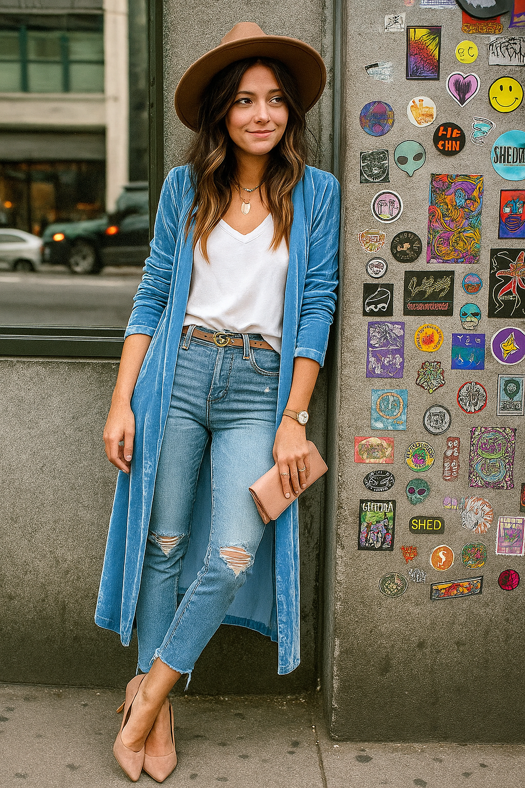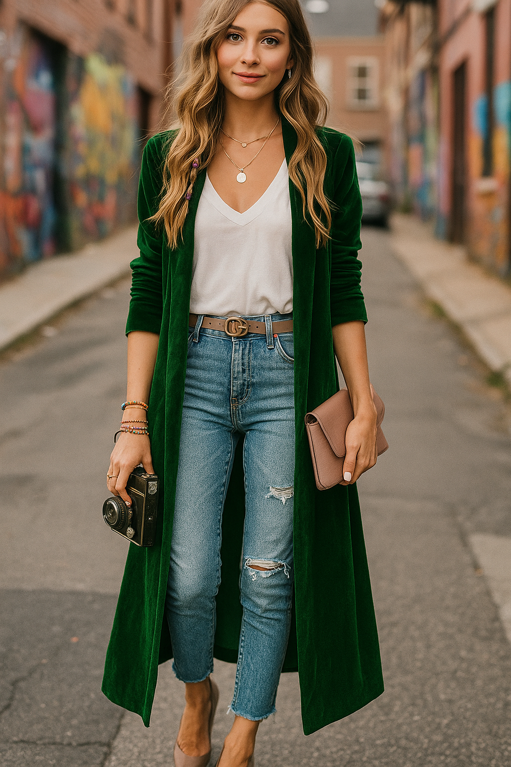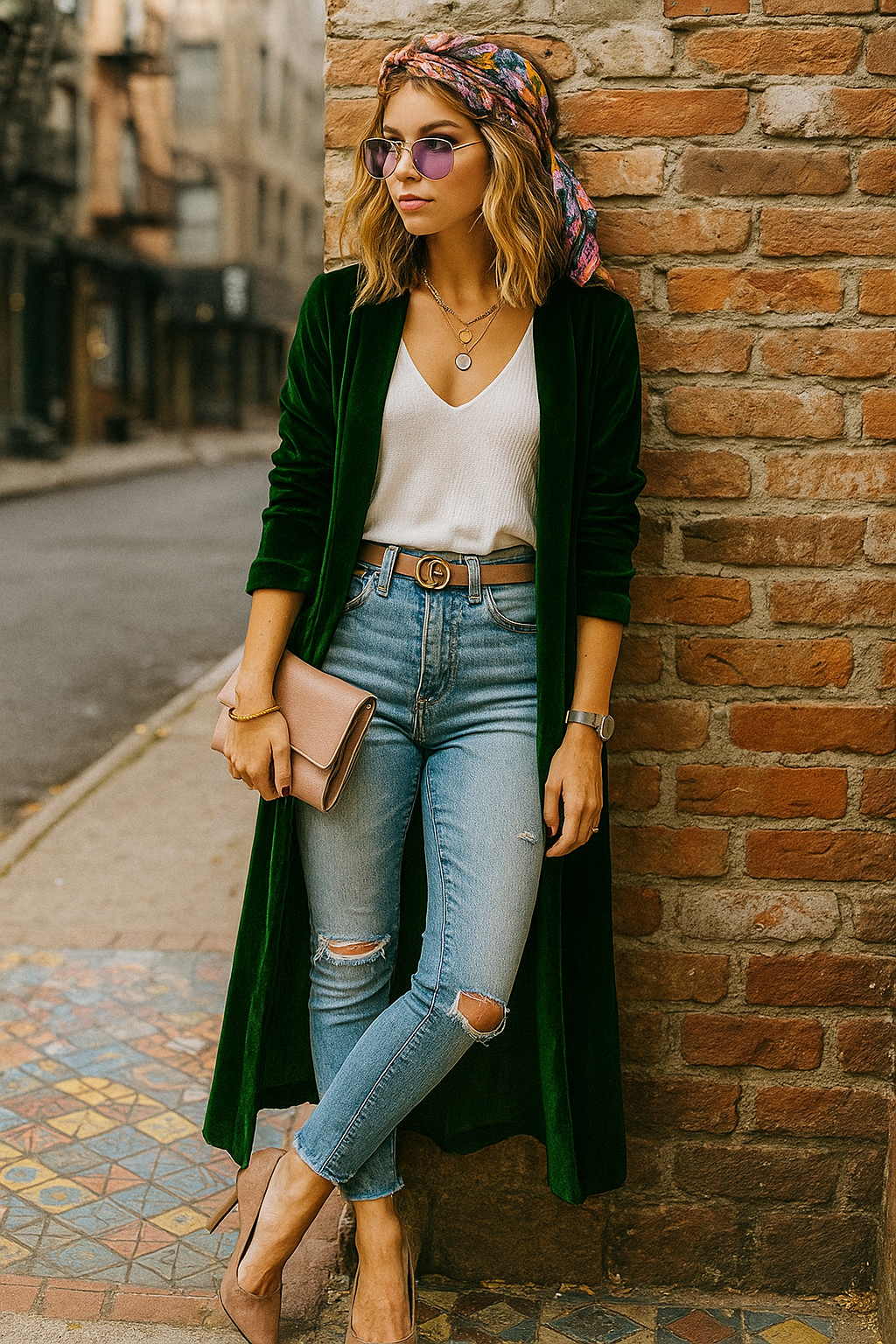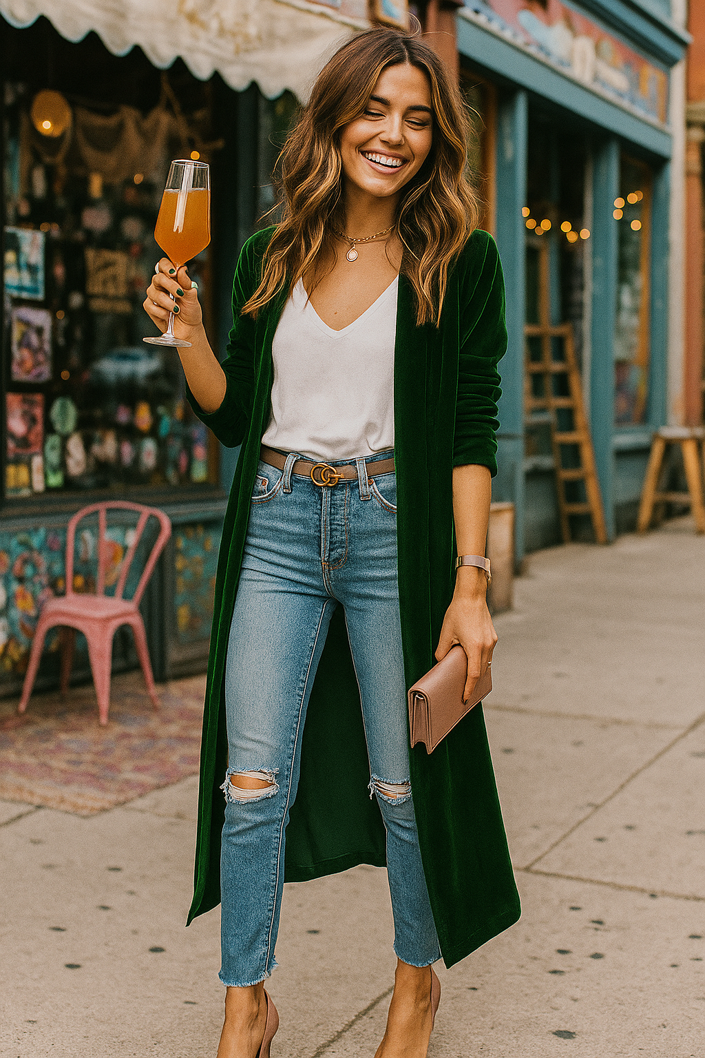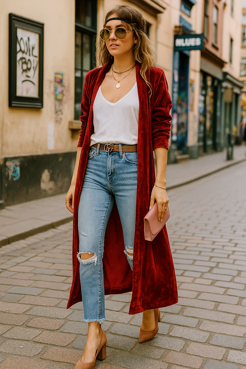 Step into timeless vintage-inspired style with this luxurious velour longline cardigan. Designed with a rich sheen and soft drape, it flows effortlessly with every movement, giving it an elegant yet relaxed aesthetic. The open front silhouette offers versatility, making it perfect for layering over casual outfits or dressing up for a chic evening look. Its duster length adds drama and the split hem brings a touch of sophistication. Open patch pockets for all of your essentials. While the plush texture channels a retro glam vibe reminiscent of 70s bohemian and disco glam influences. With its comfortable stretch and lightweight feel, this piece effortlessly blends statement style with everyday wearability.