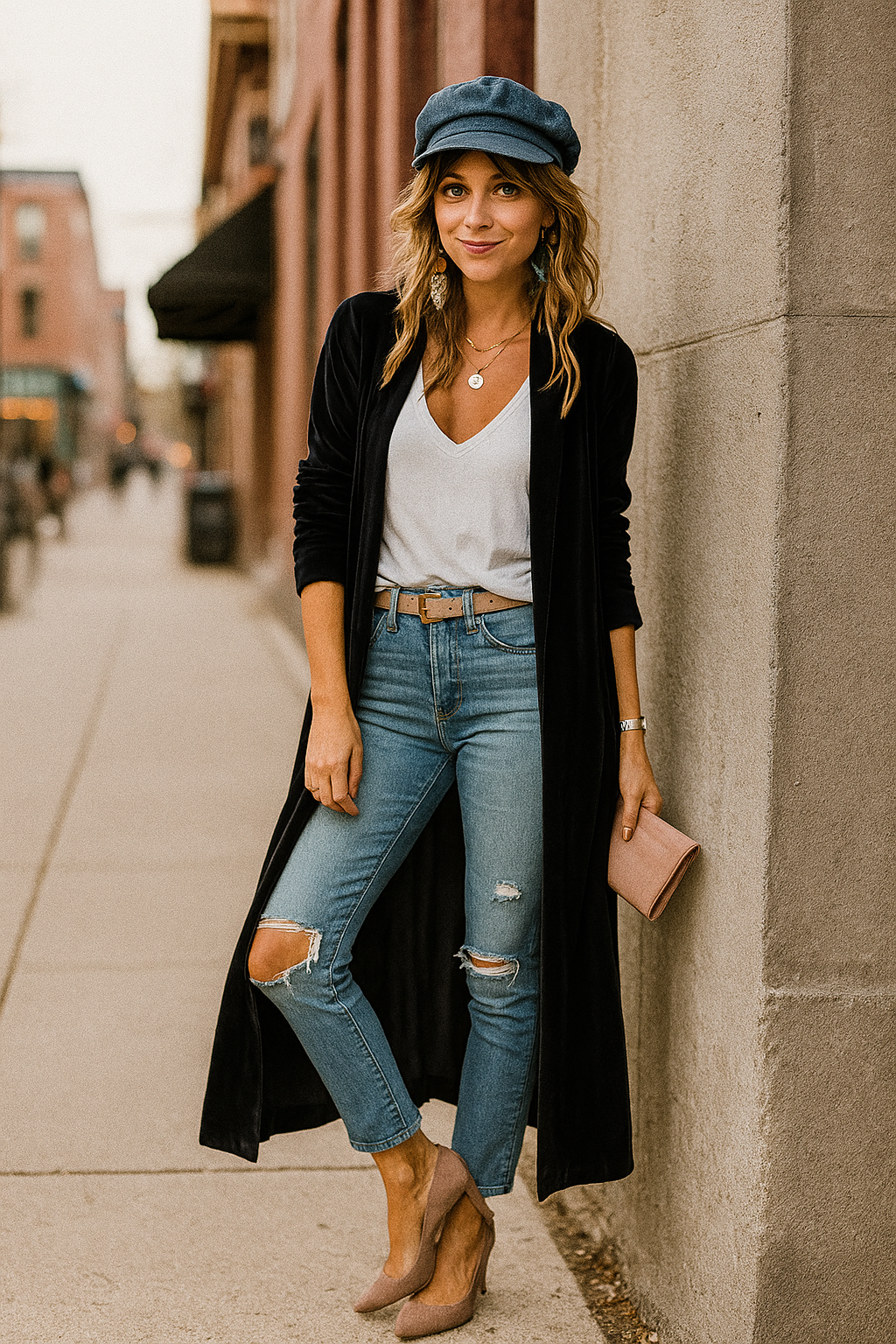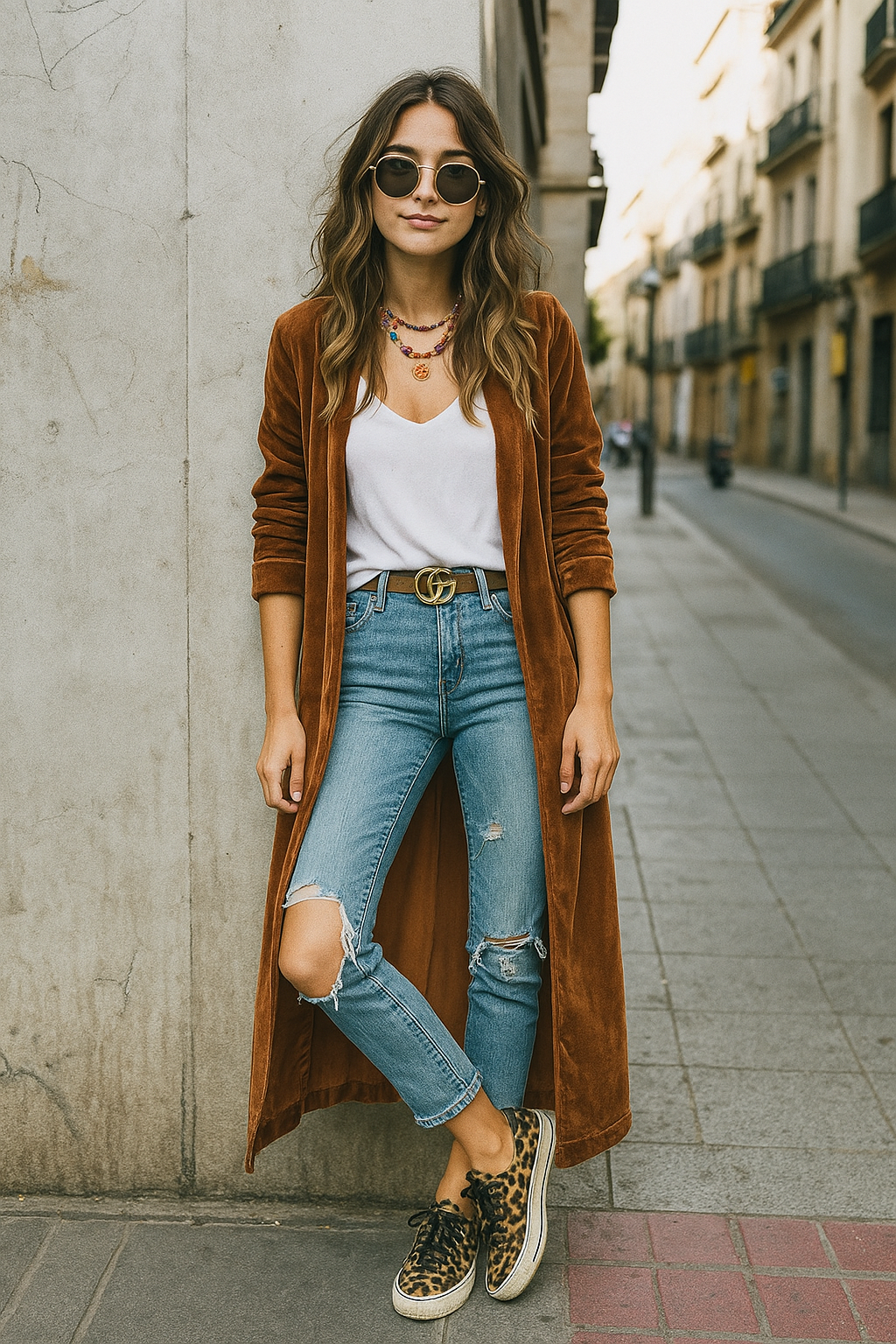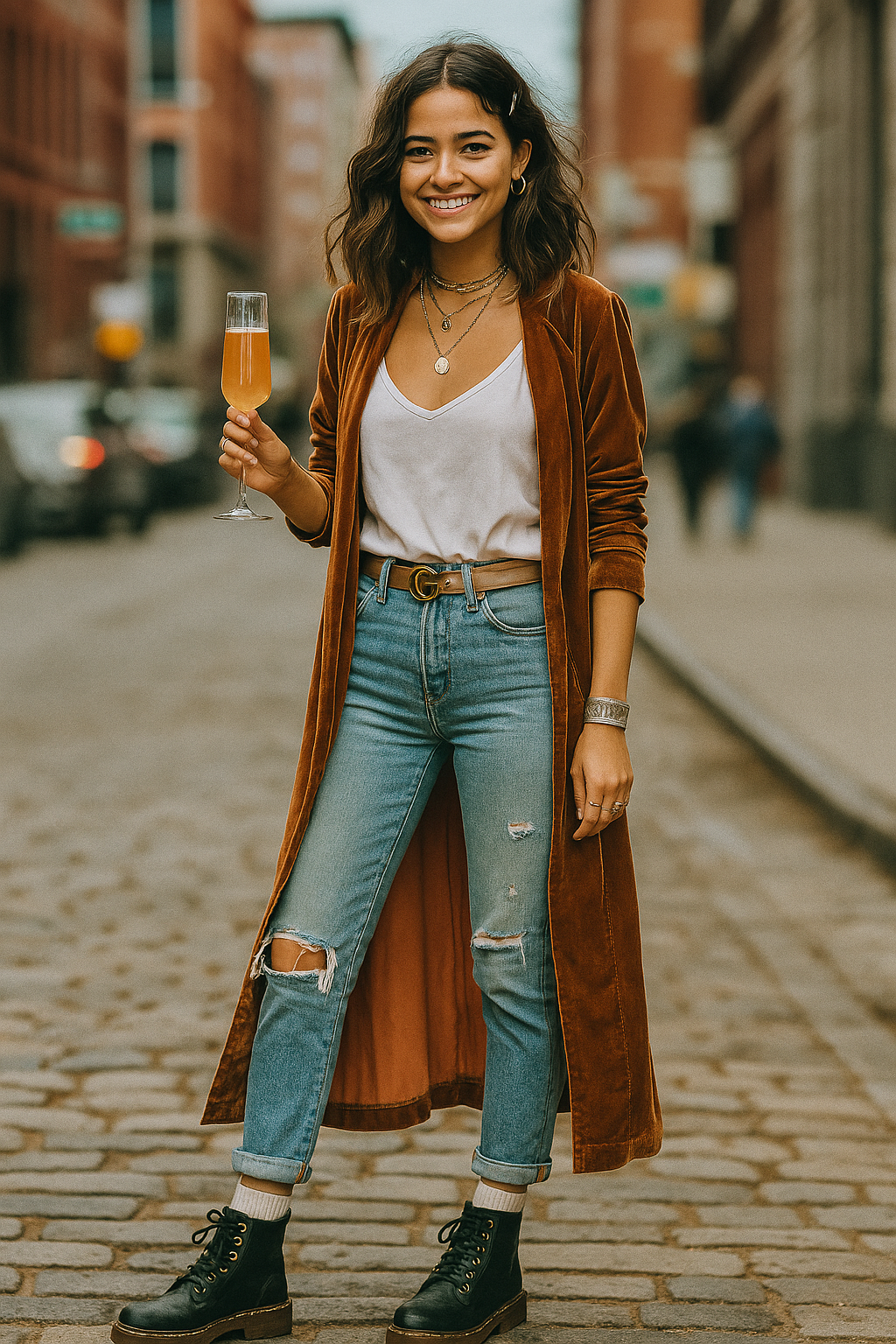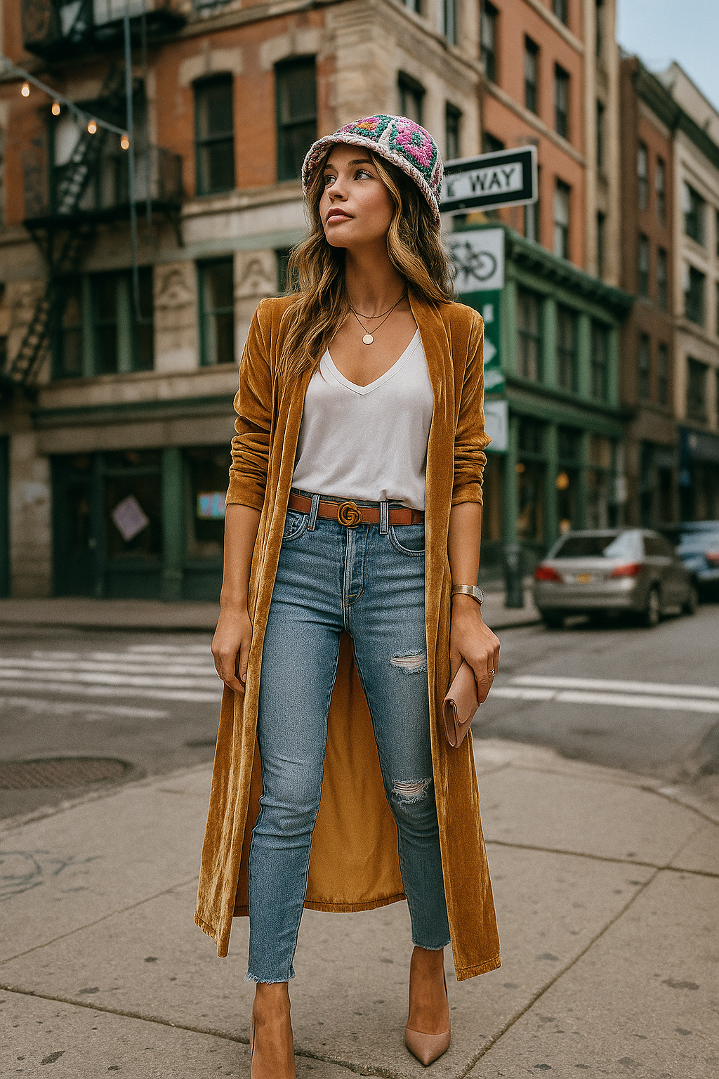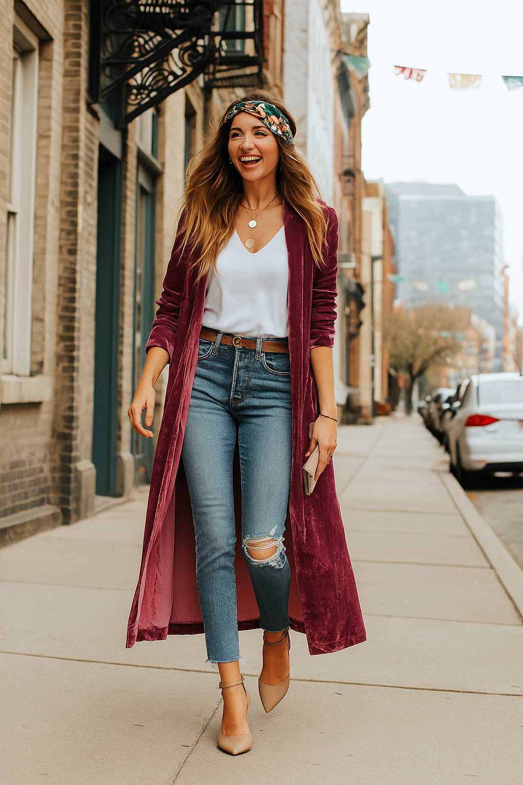 Step into timeless vintage-inspired style with this luxurious velour longline cardigan. Designed with a rich sheen and soft drape, it flows effortlessly with every movement, giving it an elegant yet relaxed aesthetic. The open front silhouette offers versatility, making it perfect for layering over casual outfits or dressing up for a chic evening look. Its duster length adds drama and the split hem brings a touch of sophistication. Open patch pockets for all of your essentials. While the plush texture channels a retro glam vibe reminiscent of 70s bohemian and disco glam influences. With its comfortable stretch and lightweight feel, this piece effortlessly blends statement style with everyday wearability.