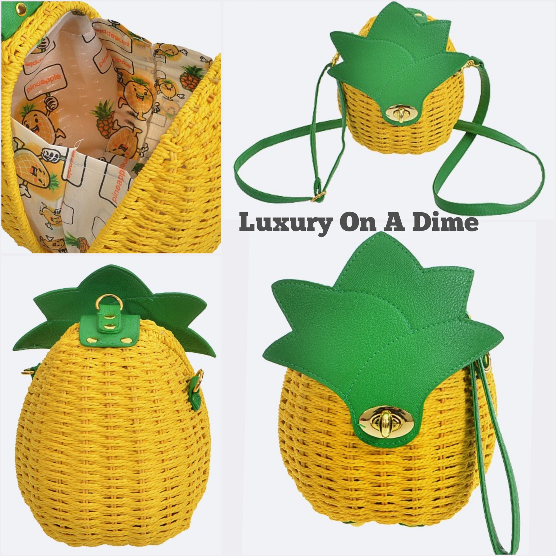 The front has gold tone hardware, twist lock closure, and a wide clam shell opening lined with adorable pineapple print fabric inside.