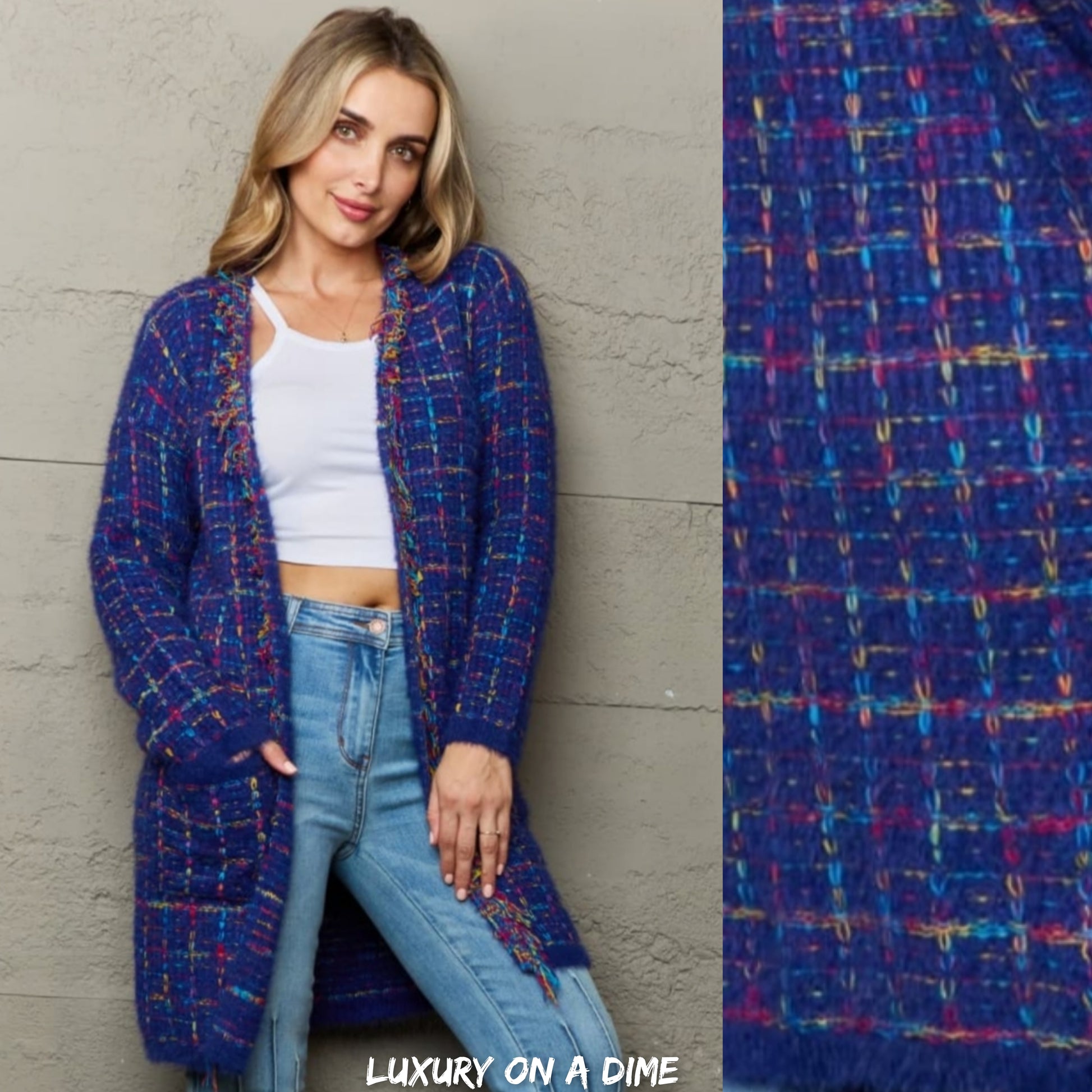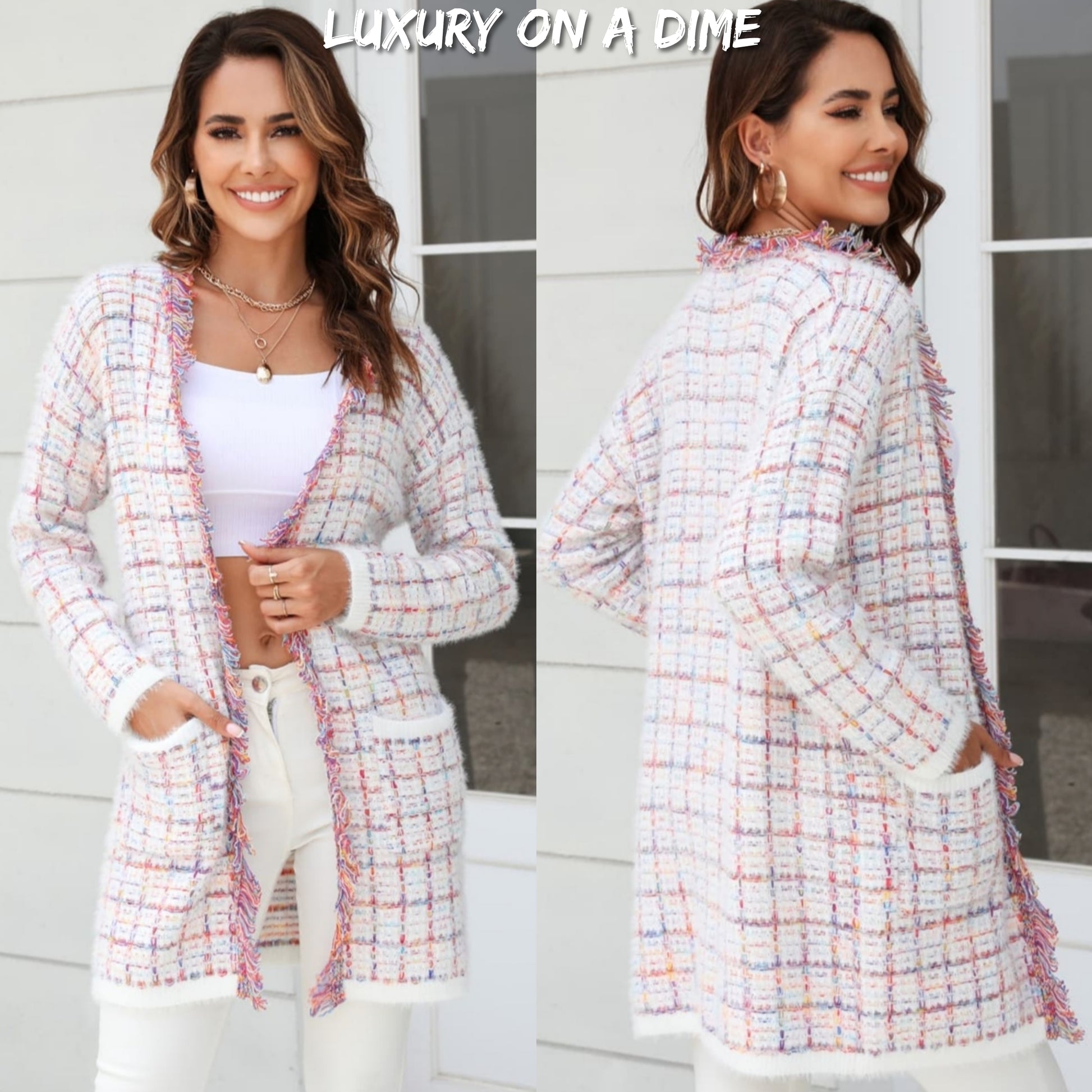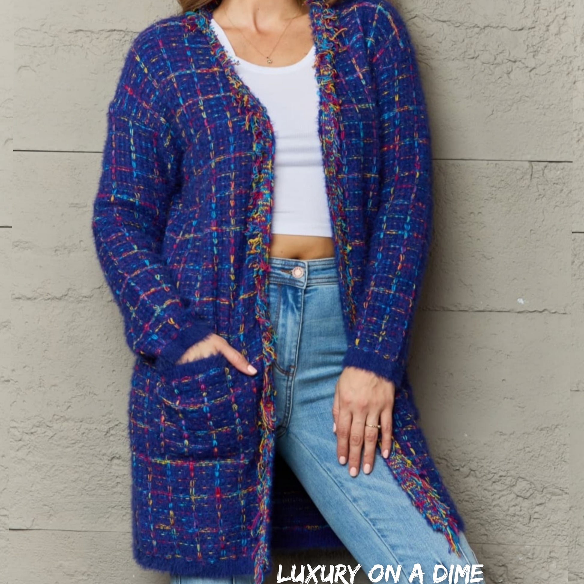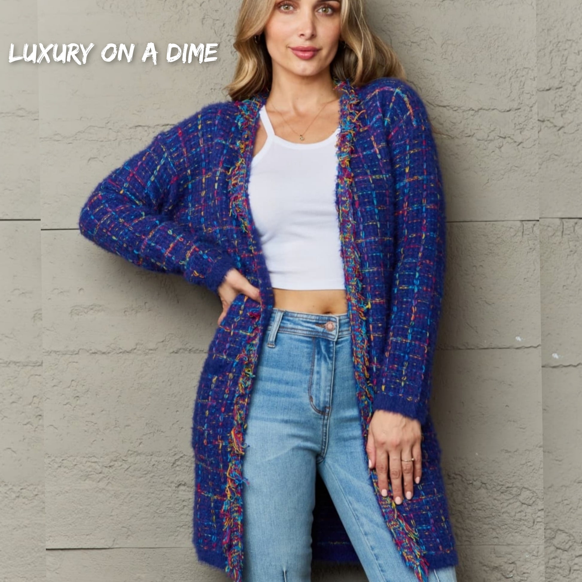 Plaid Retro Knit Colorful Fringe Fur Hem Longline Sweater Cardigan
