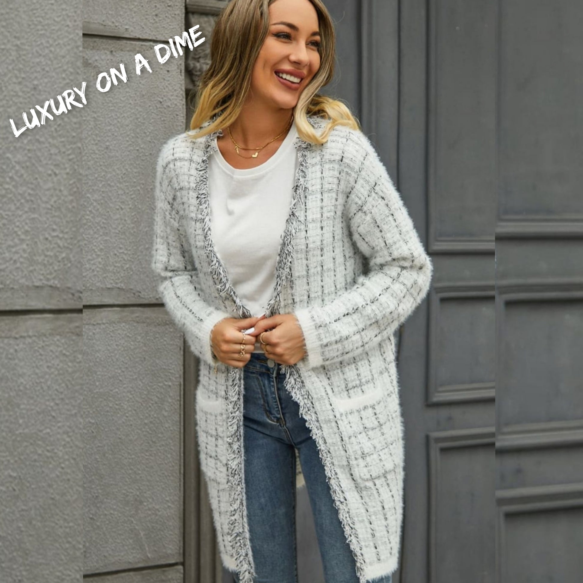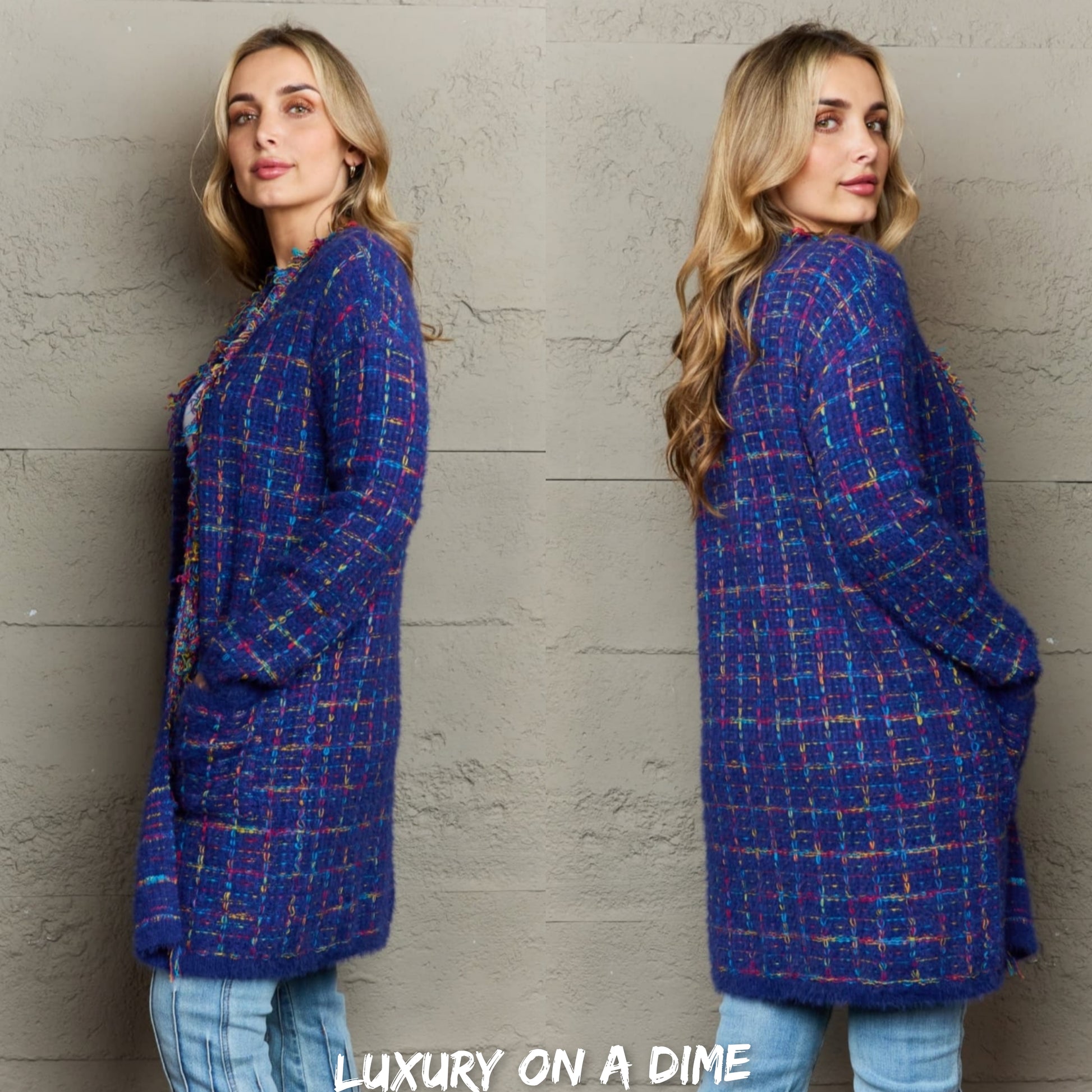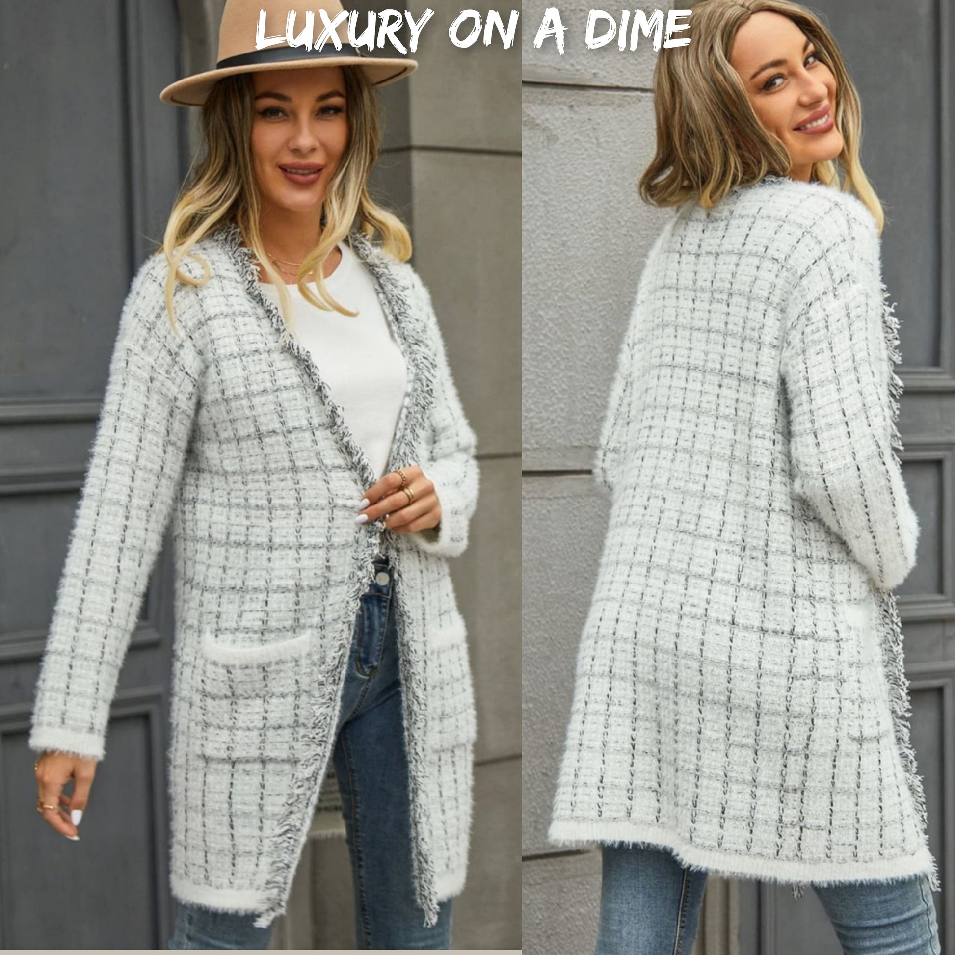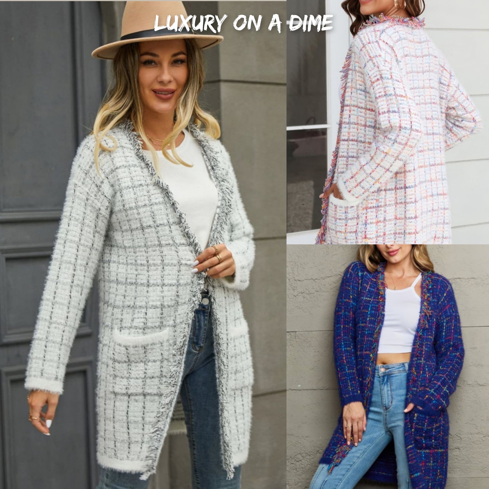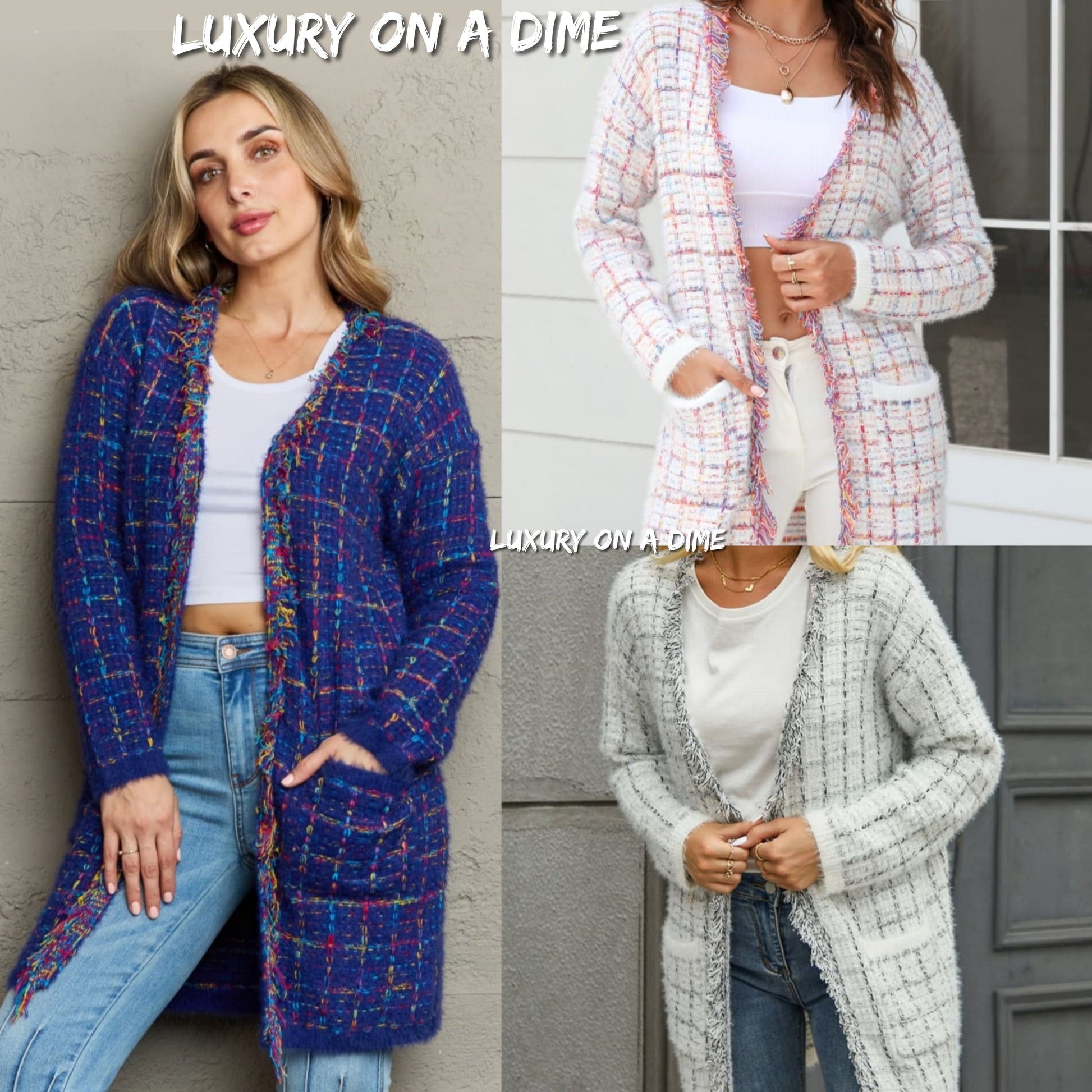 Plaid Retro Knit Colorful Fringe Fur Hem Longline Sweater Cardigan