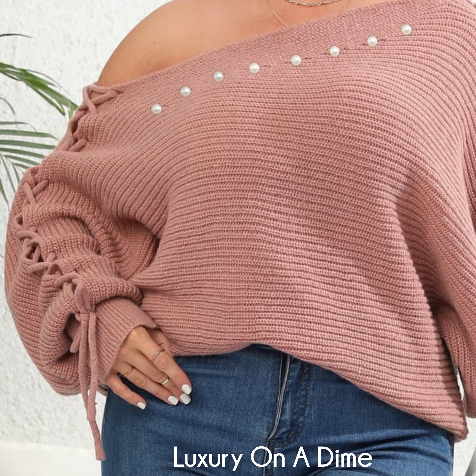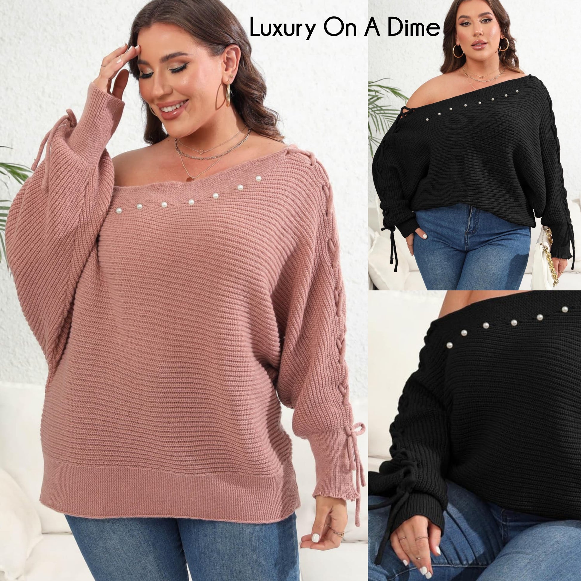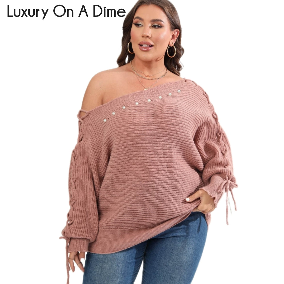 Beaded Pearl Lace Up Sleeve Off Shoulder Asymmetrical Boat Neck Sweater Plus Size Only