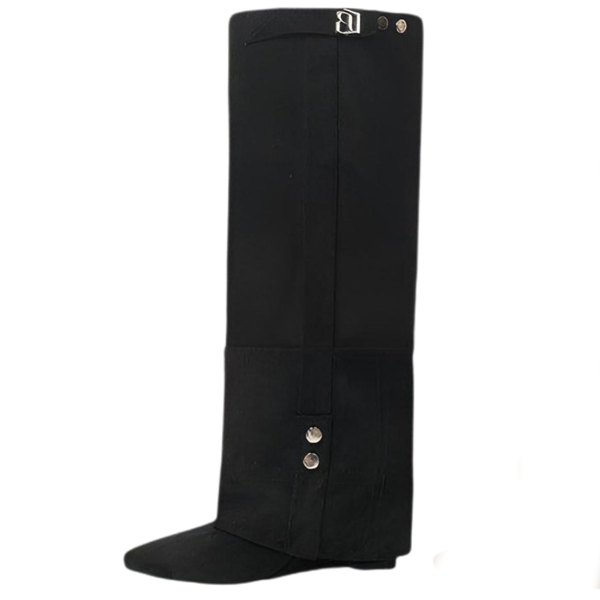 These pointed toe vegan faux suede knee-high boots bring together boho western, minimalist luxe, and vintage-inspired aesthetics in a sleek, versatile silhouette. The soft faux suede texture adds an elevated yet relaxed touch, while the pointed toe and low heel create a refined, timeless look that moves effortlessly from day to night. Subtle metallic accent details lend a hint of modern edge without overpowering the design, keeping the overall feel understated and chic. Perfect for autumn and winter styling, these boots embody quiet luxury and boho sophistication. They feature an loverlay cover, adding a touch of edgy elegance to every outfit. Whether you’re styling for a weekend escape, a coffee date, or city strolls, these boots channel effortless confidence and modern femininity with a nature-inspired aesthetic.