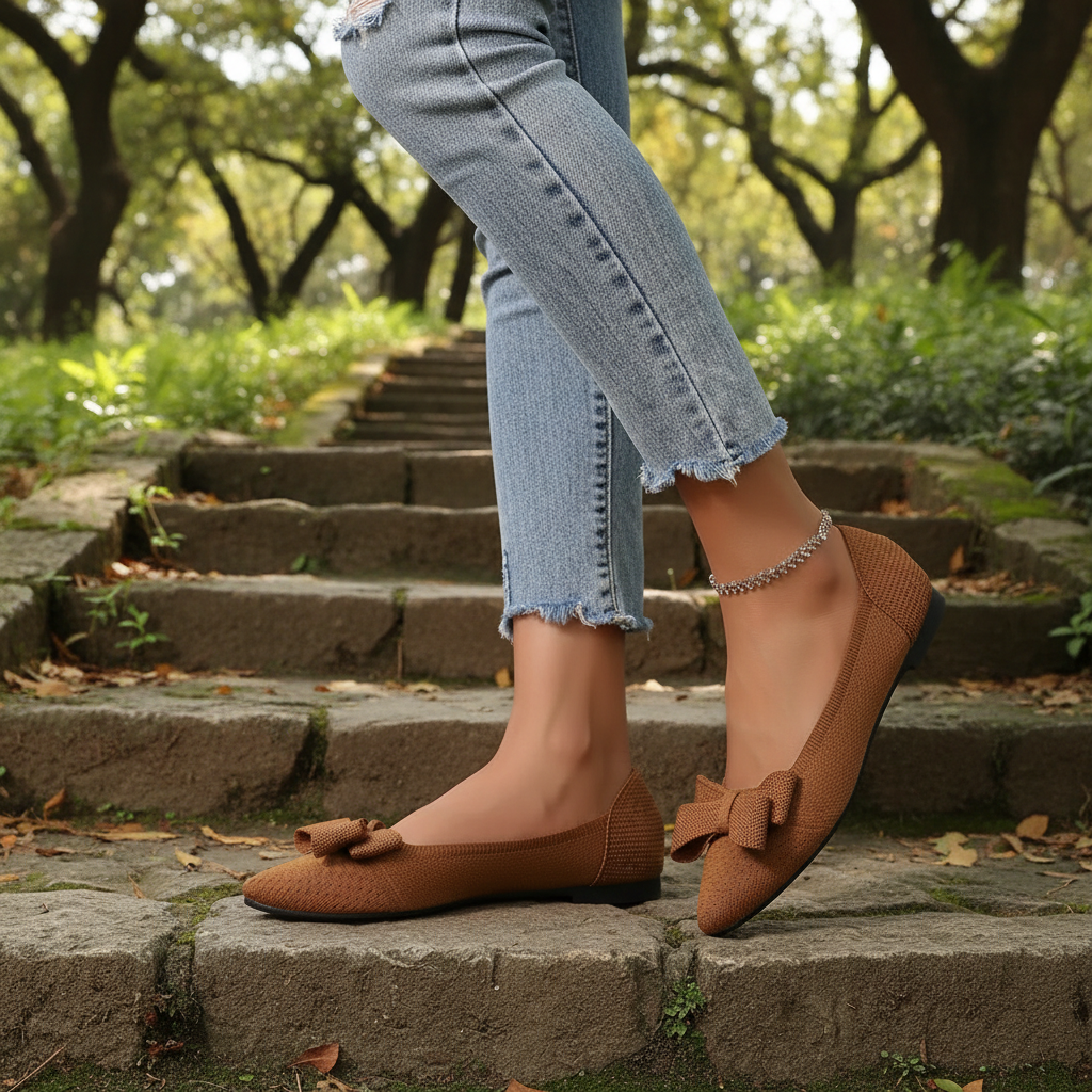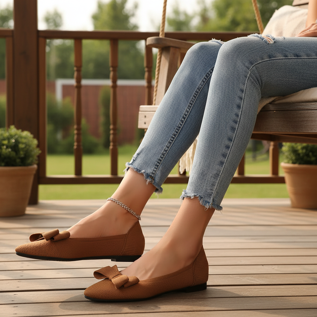 These mesh knit flats combine a pointed-toe silhouette with a bold sculpted bow accent, creating a look that is both soft and statement-driven. The breathable knit upper offers flexible stretch and easy movement, while the lightweight structure keeps the shoes comfortable for everyday wear. The oversized bow adds a playful yet polished touch that stands out without overwhelming the minimalist coquette charm. Designed with a slip-on construction, these flats are convenient and comfortable, making them great for warm-weather days or year-round styling. The interior features gentle cushioning for added support, and the flat outsole keeps the profile sleek and easy to walk in. Blending elements of cute charm, modern femininity, bowcore style, soft elegance, minimalist chic, and everyday comfort, these ballet-inspired loafers bring an approachable yet refined feel to casual and semi-dressy outfits.