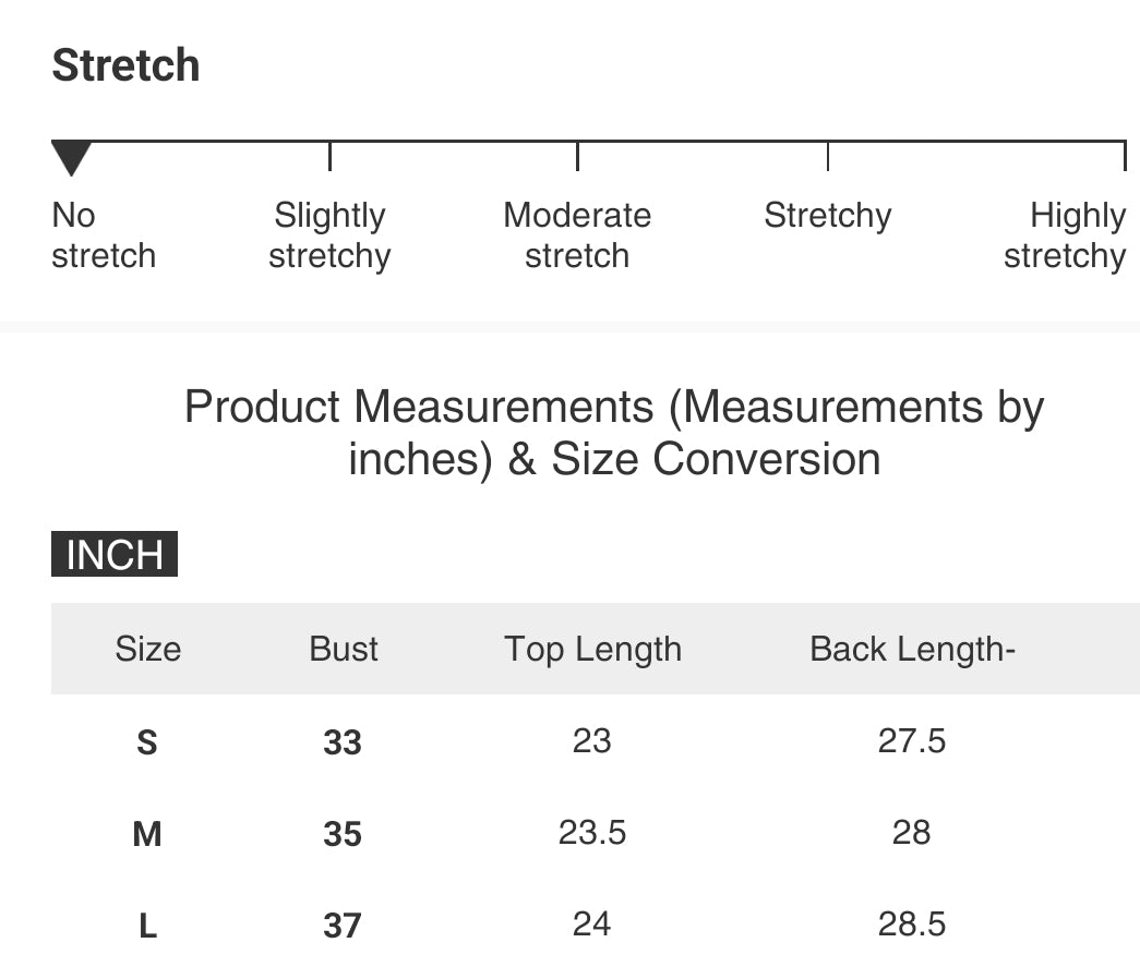 | Size | Bust | Top Length | Back Length- | Shoulder |