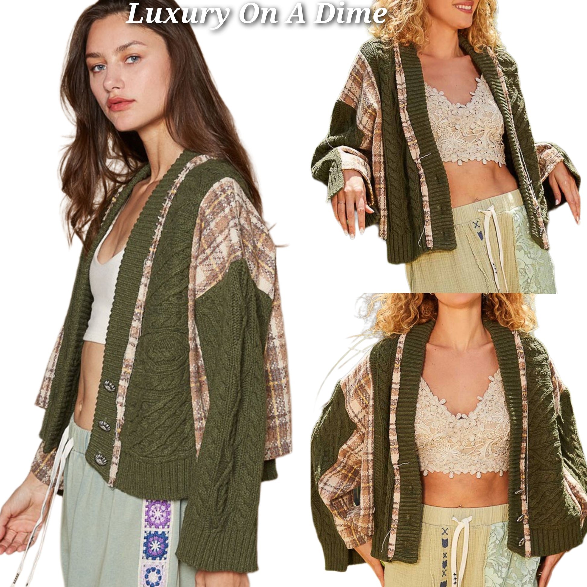 POL Cable Knit Jacket Patchwork Retro Button-up Chunky Plaid Oversized Cardigan