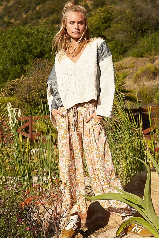 POL Quilted Waffle Cable Knit Patchwork High-low Top Long Sleeve Crop Sweater