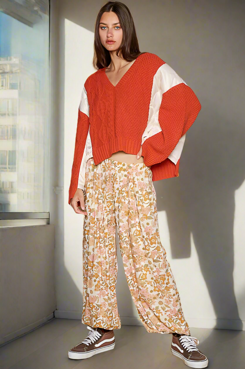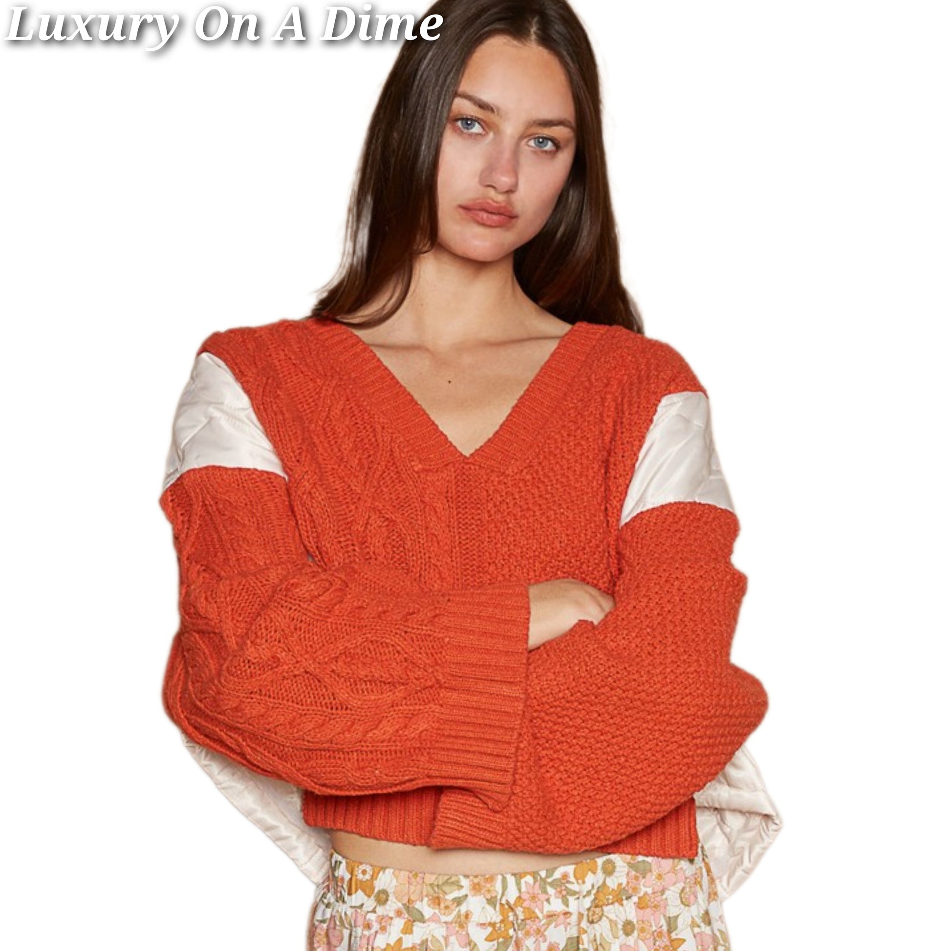 POL Quilted Waffle Cable Knit Patchwork High-low Top Long Sleeve Crop Sweater