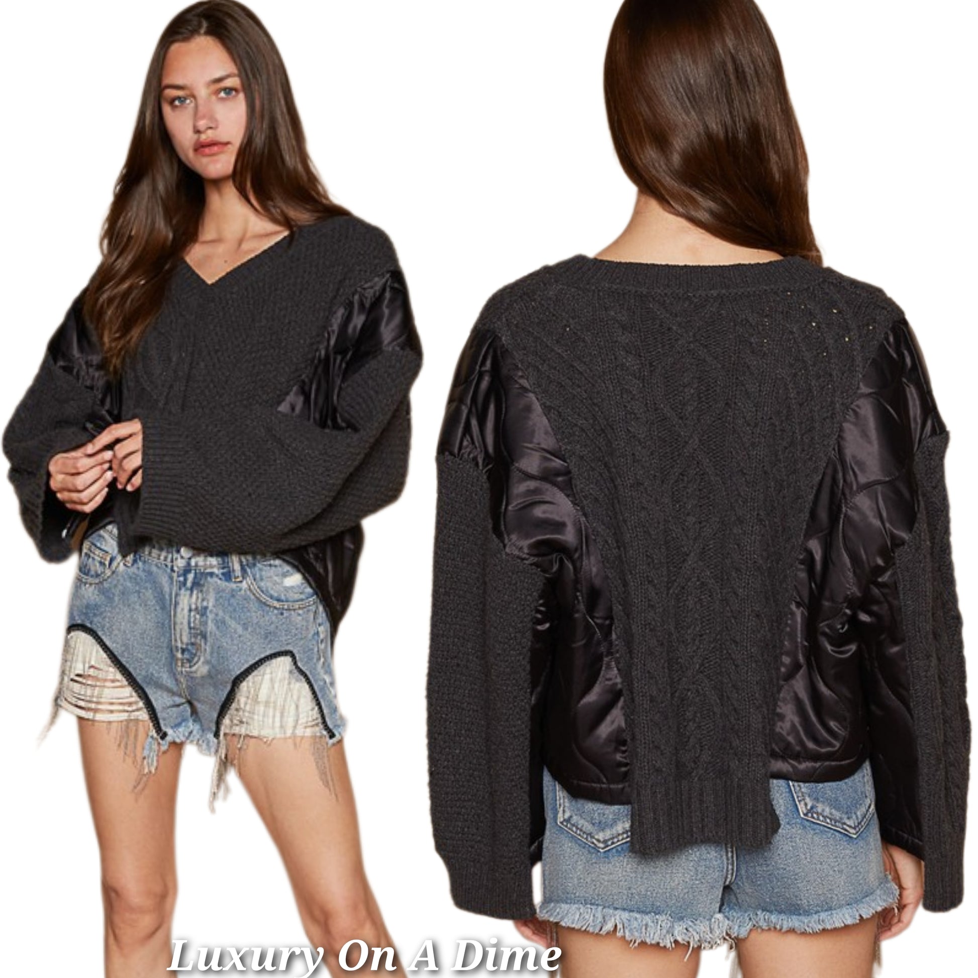 POL Quilted Waffle Cable Knit Patchwork High-low Top Long Sleeve Crop Sweater