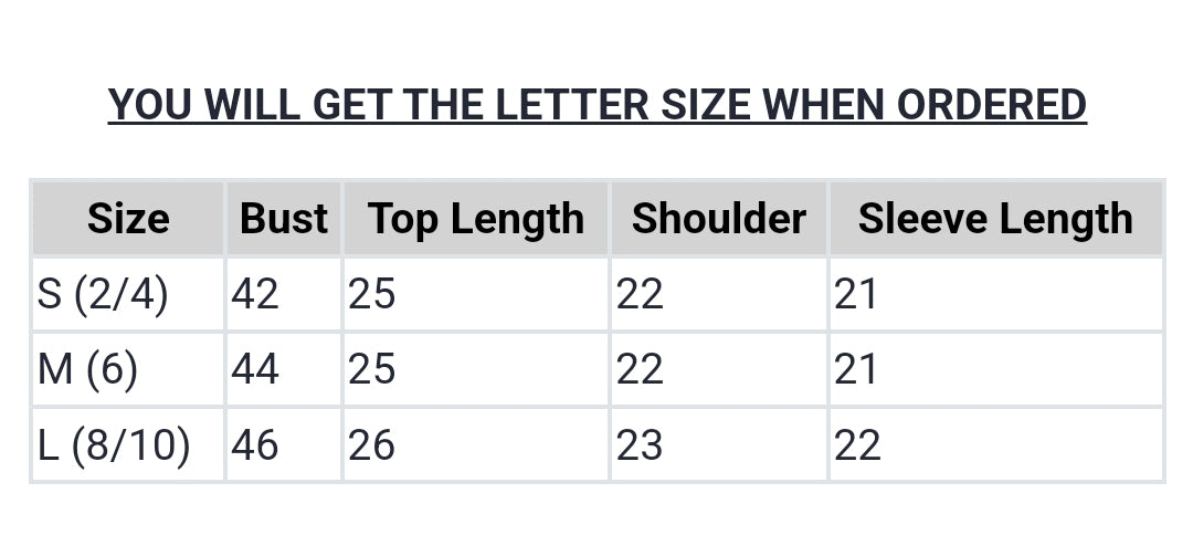 | Size | Bust | Top Length | Shoulder | Sleeve Length |
