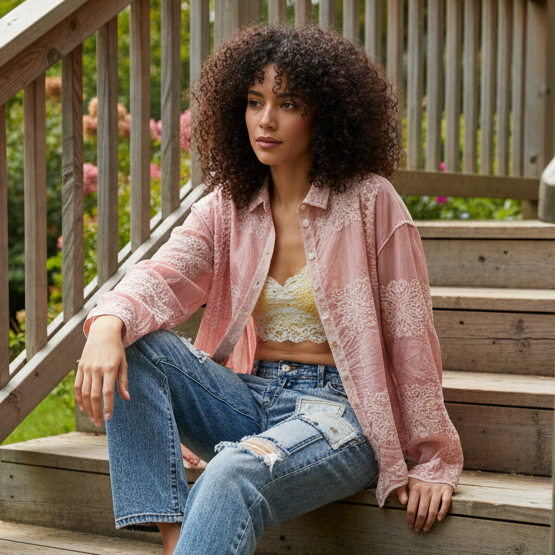 This embroidered button down playful shirt presents a softly structured silhouette rooted in romantic core, cottagecore, and vintage inspired aesthetics, designed to feel lightweight, breathable, and effortlessly expressive. Crafted with delicate all over embroidery, the fabric showcases intricate floral motifs that echo handmade core, heirloom textile traditions, and slow fashion values. The classic girl-next-door button down front introduces subtle structure, balancing the fluid drape with a timeless, wearable foundation that aligns with everyday bohemian and natural romantic styling. Long sleeves contribute relaxed coverage while maintaining an airy feel, reinforcing a calm, unfussy elegance associated with grannycore and folk inspired dressing. The scalloped shirttail hem adds gentle movement and visual softness, creating an organic finish that enhances layering versatility and relaxed proportions. Overall, this shirt functions as a refined yet easy wardrobe essential, blending artisanal detail, natural textures, and nostalgic charm into a piece that feels both timeless and quietly expressive.