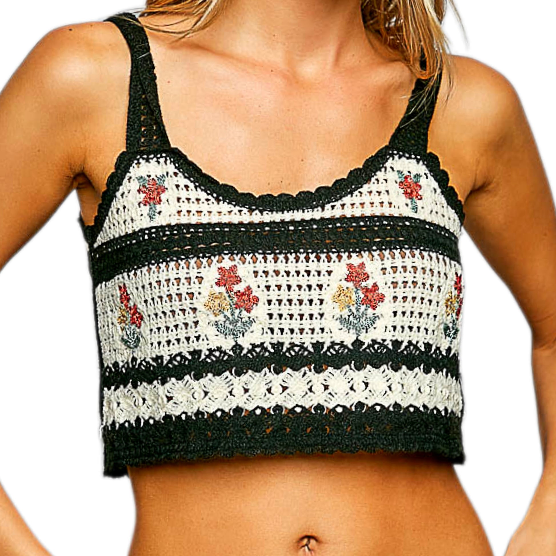 POL Floral Embroidered Granny Crochet Knit Cami Crop Top Boho Sleeveless Shirt Black