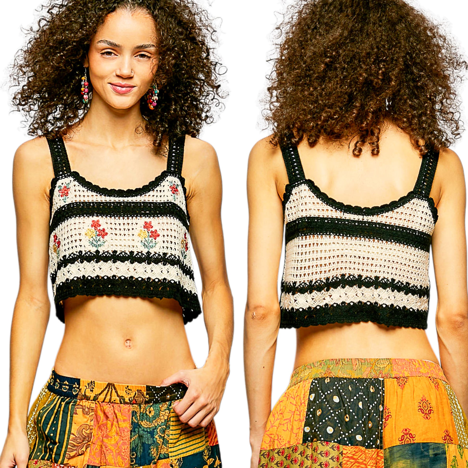 POL Floral Embroidered Granny Crochet Knit Cami Crop Top Boho Sleeveless Shirt