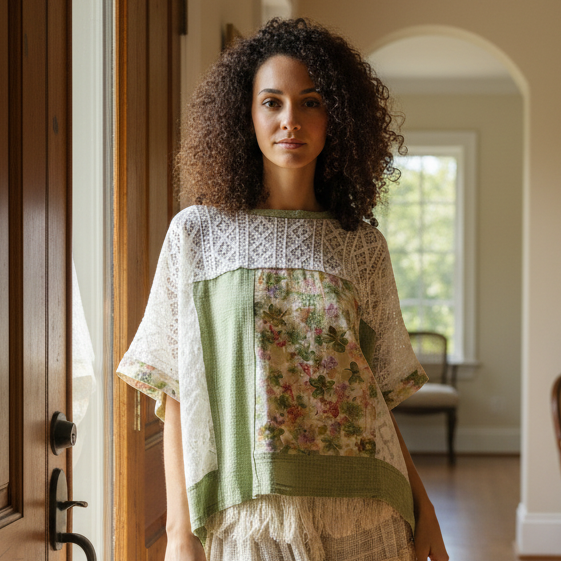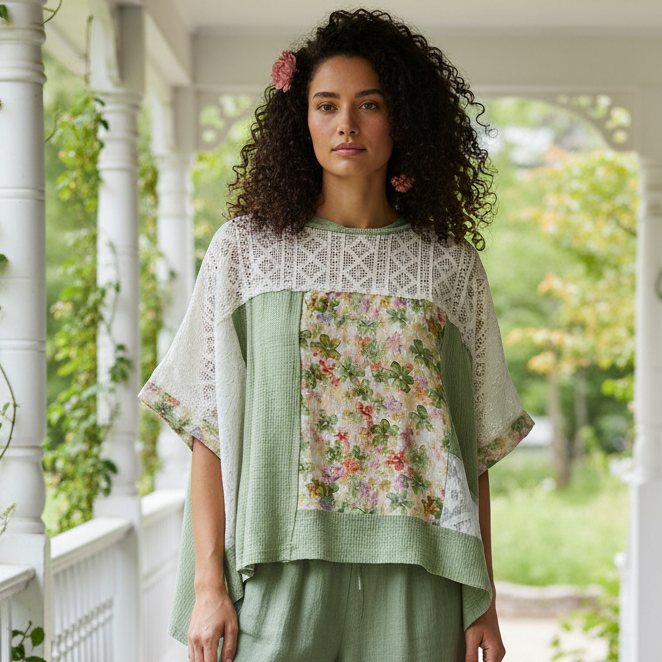 This lightweight blouse features a oversized relaxed silhouette. It blends floral patchwork panels, lace accents, and waffle knit texture into a cohesive design rooted in nostalgic, grandma-like craftsmanship. The construction highlights exposed seams, giving the piece an intentionally unfinished quality that feels organic and heritage with an expressive quality. Patchwork sections introduce visual depth and a handcrafted sensibility, while lace elements add softness and a sense of romantic tradition associated with grannycore and coquette girl-next-door inspired clothing. The breathable waffle knit fabric supports comfort and ease, allowing the blouse to drape naturally and move fluidly throughout the day. Its loose fit and airy structure reflect bohemian ease, slow living ideals, and vintage influenced femininity, creating a garment that feels personal, layered, and quietly artistic. Designed as a statement yet wearable piece, it embodies relaxed creativity, timeless charm, and an appreciation for texture driven design over trend focused fashion.