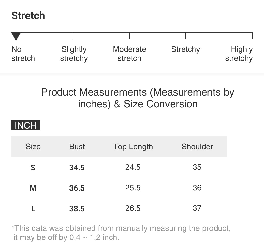| Size | Bust | Top Length | Shoulder |