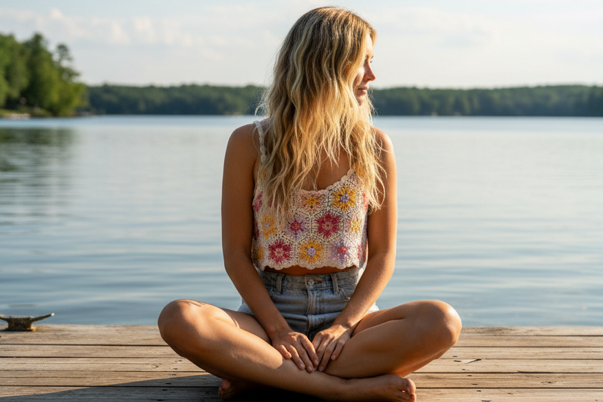 This crochet crop cami delivers a handcrafted, nostalgic retro feel. Lending a bohemian, grannycore, and folk inspired aesthetics while maintaining a clean, wearable silhouette. Designed with a cropped length and a softly structured cami shape, the piece highlights traditional crochet construction paired with delicate floral embroidery that reinforces handmade core and slow fashion values. The openwork floral granny square stitch pattern creates natural breathability and texture, allowing the garment to feel light, expressive, and comfortably worn in everyday settings. Scalloped edging along the neckline, straps, and hem adds a refined decorative finish that draws from vintage revival and cottage influenced styling without appearing overly ornate. The fitted yet relaxed structure balances femininity with ease, making it an adaptable layering piece that aligns with festival style, eclectic wardrobes, and casual boho dressing. This top functions as a statement essential that blends artisanal craft, nostalgic charm, and effortless individuality into a timeless, expressive form.