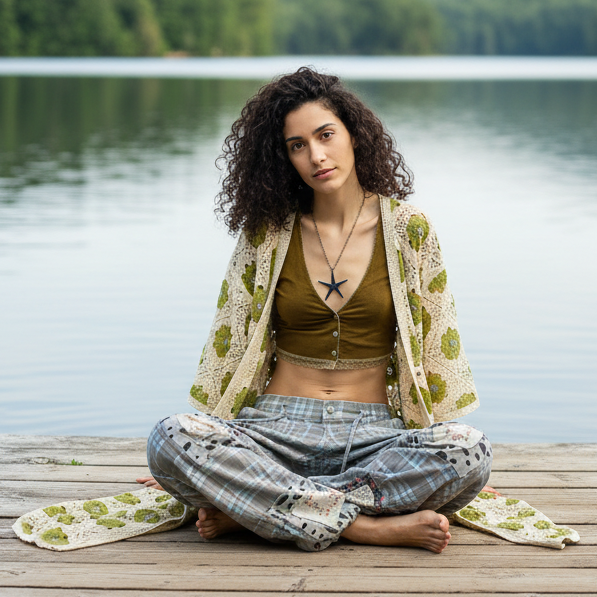 This longline crochet cardigan presents a flowing, expressive silhouette that merges handcrafted tradition with a relaxed, free spirited sensibility rooted in bohemian, grannycore, and folk inspired aesthetics. Designed as an open front duster, the piece drapes effortlessly through the body, creating movement and visual softness while maintaining a strong artisanal presence. The floral openwork crochet construction draws from vintage revival and handmade core influences, featuring repeating floral motifs that evoke cottagecore, earthcore, and slow fashion values through their textured, breathable structure. Contrasting patchwork elements are thoughtfully integrated, adding depth and visual storytelling that nods to eclectic fashion, upcycled aesthetics, and creative individuality. The elongated length and loose fit reinforce an effortless, layered approach to styling, while the wide sleeves enhance the relaxed profile with a subtle retro girl-next-door undertone. This playful cardigan functions as a statement layering piece grounded in boho revival, artisanal craft, and nostalgic romance, offering a versatile outer layer that feels expressive, intentional, and timeless.