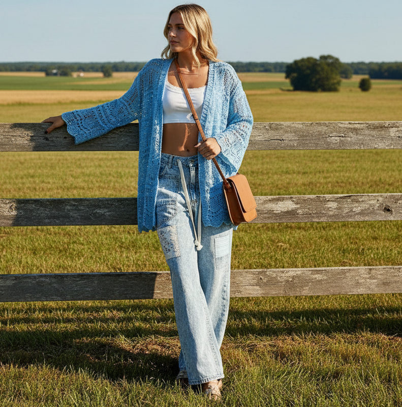This blends grannycore, boho, and cottagecore aesthetics through a lightweight openwork knit that emphasizes texture, airflow, and visual rhythm. The relaxed drape and elongated silhouette support an easy indie and soft girl sensibility, while the patterned knit panels introduce a subtle vintage and craftcore influence inspired by handmade traditions. Scalloped edging along the hem and cuffs adds gentle movement and a decorative finish that leans into a romantic and whimsical mood. Long sleeves enhance versatility, allowing function as a transitional piece for casual, expressive styling. The open front design keeps the look fluid and unfixed, aligning with fairycore and nostalgic styling cues that feel personal and effortless. This piece focuses on comfort, texture, and individuality through a balanced mix of heritage inspired knitwork and modern relaxed wear. The elongated length and loose fit reinforce an effortless, layered approach to styling, while the wide sleeves enhance the relaxed profile with a subtle retro girl-next-door undertone. This playful cardigan functions as a statement boho revival, artisanal craft, and nostalgic romance, offering a versatile outer layer that feels expressive, and timeless.