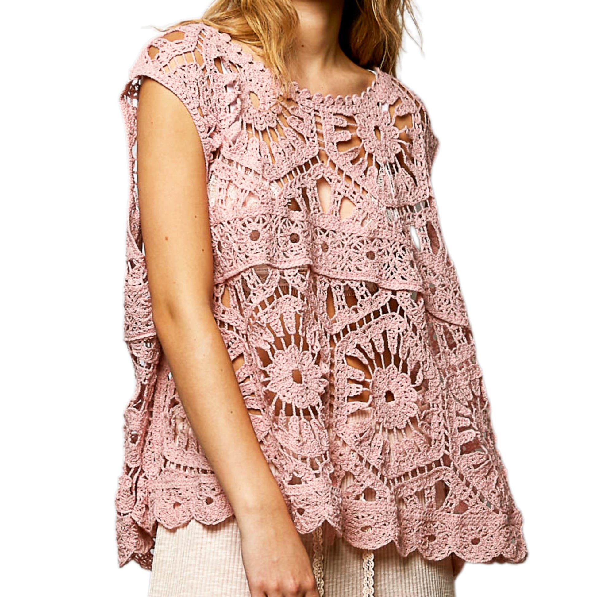 This playful sleeveless crochet tank embraces artisanal texture and a relaxed oversized proportion. Offering a statement piece that has a handcrafted traditional feel and effortless wearability. Designed with a round neckline and an openwork floral crochet lace construction. The silhouette drapes loosely through the body for an airy, oversized feel that prioritizes comfort and movement. Intricate floral motifs and geometric open stitching create visual depth while allowing breathability, making it perfect for layering over a bralette, cami or bathingsuit. The scalloped hem detail adds softness and rhythm to the overall shape, reinforcing its vintage inspired and grannycore influence. Lightweight and expressive, this piece channels bohemian ease with a subtle island mood, balancing nostalgic craftsmanship with a modern, relaxed sensibility. Built for versatility, it pairs naturally with linen trousers, denim, or flowing skirts, functioning as a creative wardrobe staple rather than a trend driven accent.
