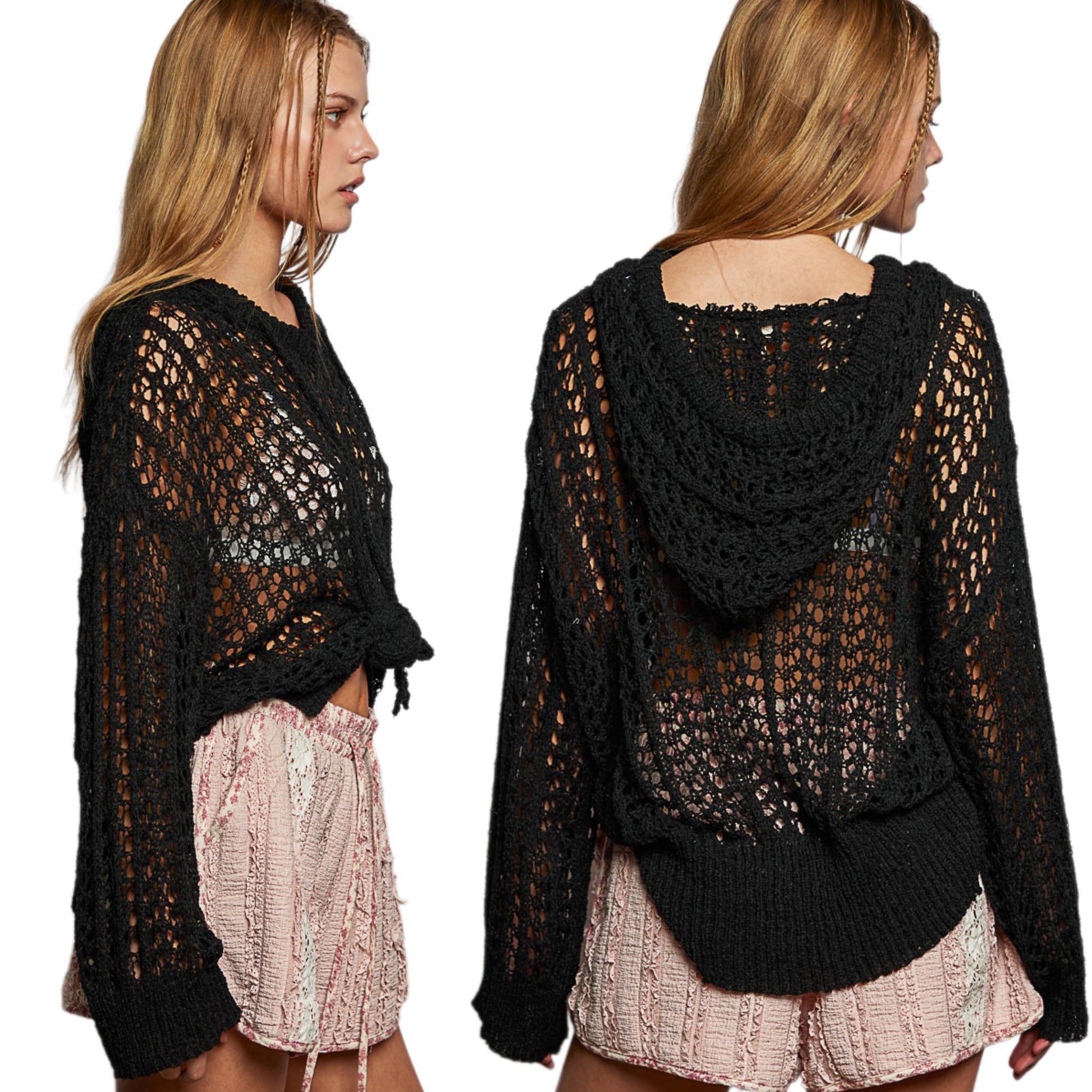 POL Crochet Hoodie Openwork Knit Top Long Sleeve High Low Pullover Sweater Shirt Black