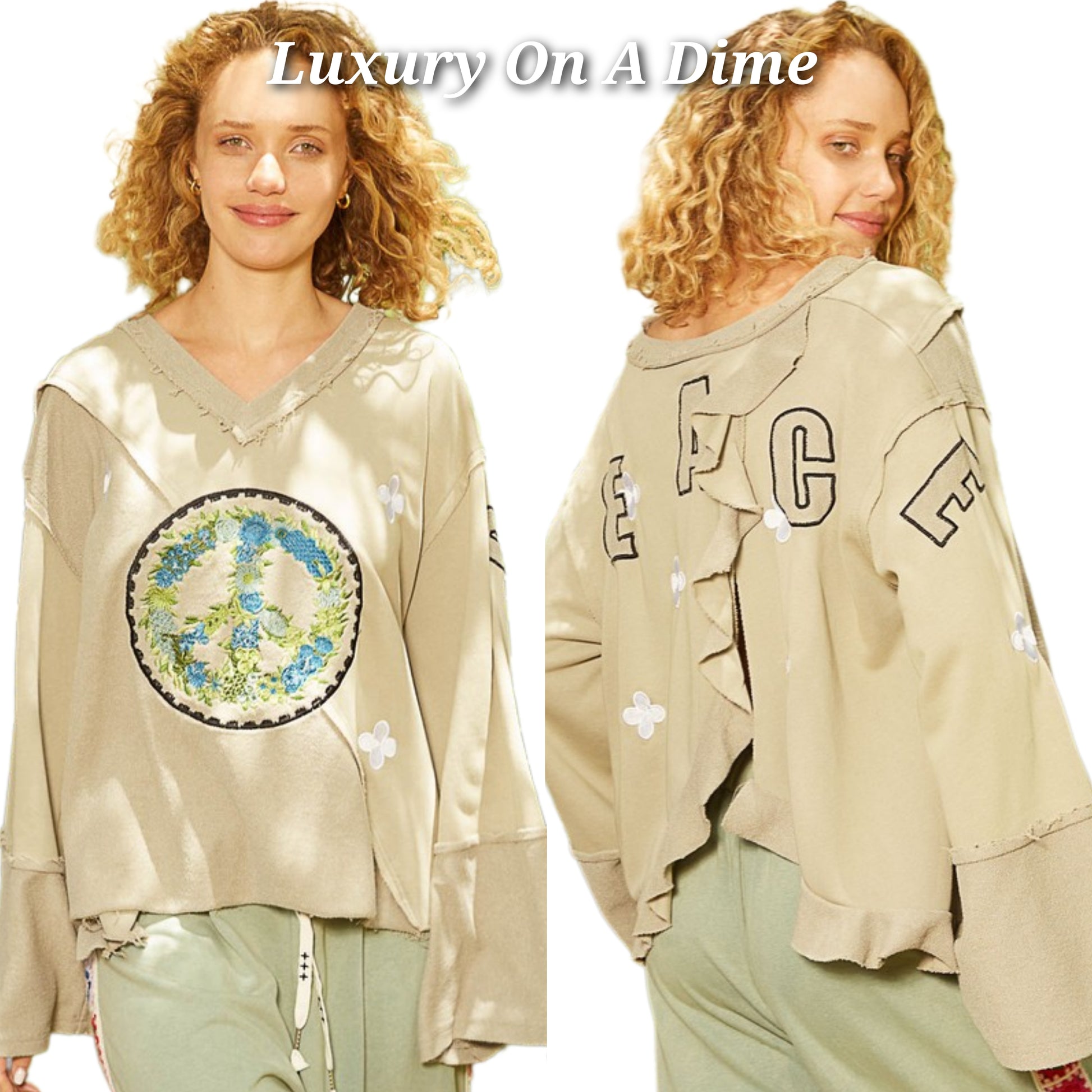 It features beautiful vintage inspired embroidery with a floral peace symbol front and the word PEACE on the back.
