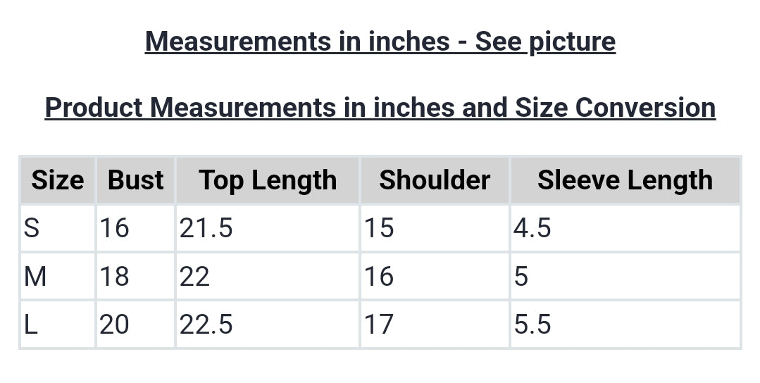| Size | Bust | Top Length | Shoulder | Sleeve Length |