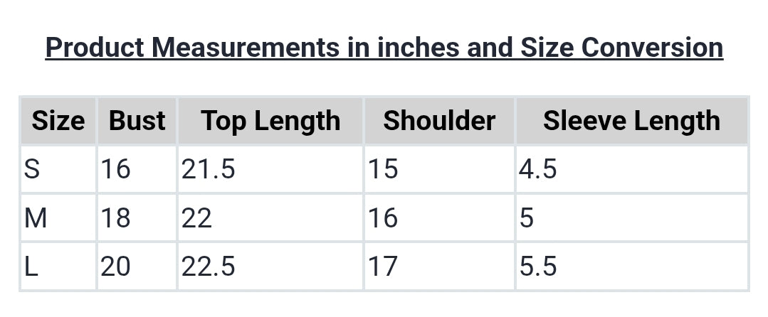 | Size | Bust | Top Length | Shoulder | Sleeve Length |
