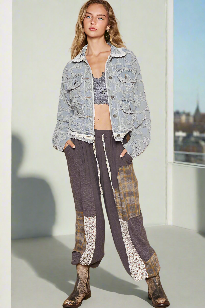 POL Star Distressed Denim Lace Collar Frayed Large Pocket Button Cotton Jacket