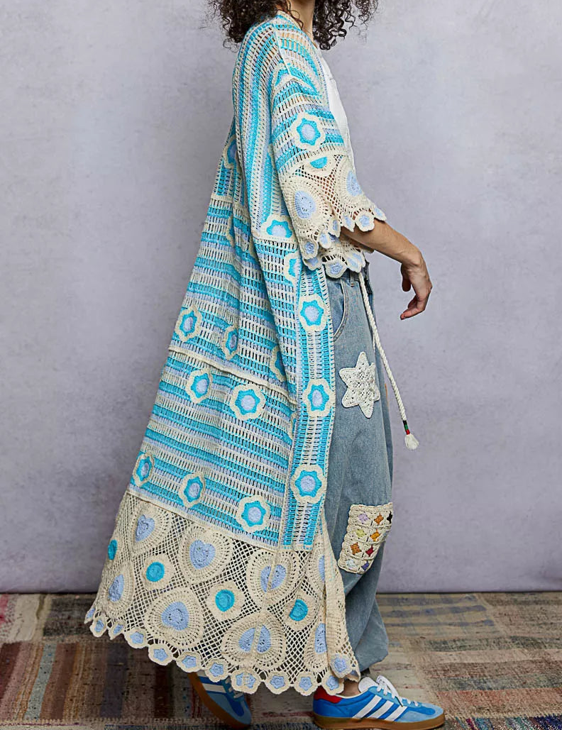 POL Patchwork Crochet Floral Openwork Knit Longline Cardigan 3/4 Sleeve Duster Blue