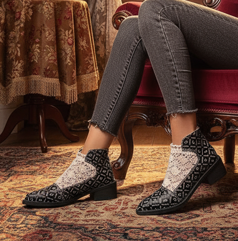 A captivating blend of boho elegance and victorian romance, these crochet knit vegan leather booties merge timeless charm with modern streetwear edge. The intricate crochet knit detailing pairs beautifully with the printed vegan PU leather, creating a look that feels both artfully vintage and urban chic. The pointed toe and block heel add refined structure, making them ideal for expressing romantic eclecticism through effortless everyday style. Designed for lovers of boho chic, victoriancore, cottagecore, and artsy vintage aesthetics, these boots evoke antique lace nostalgia and modern poetic femininity. Perfect for pairing with flowy skirts, ruffled blouses, or structured denim, they carry the essence of classic romance into contemporary fashion.