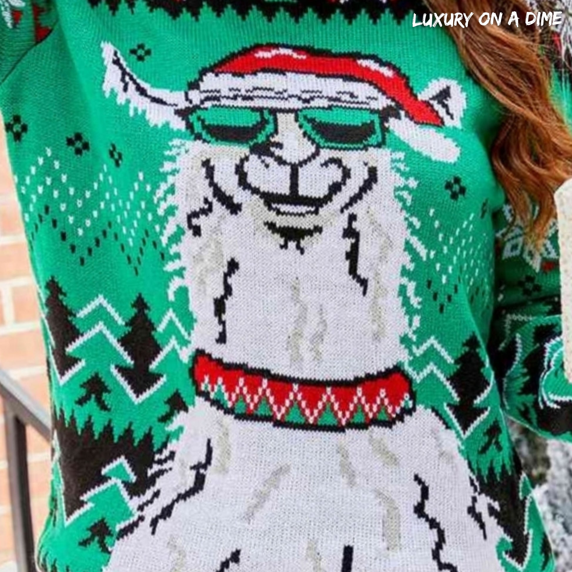 Features one adorable llama with a Santa Claus hat and sunglasses.