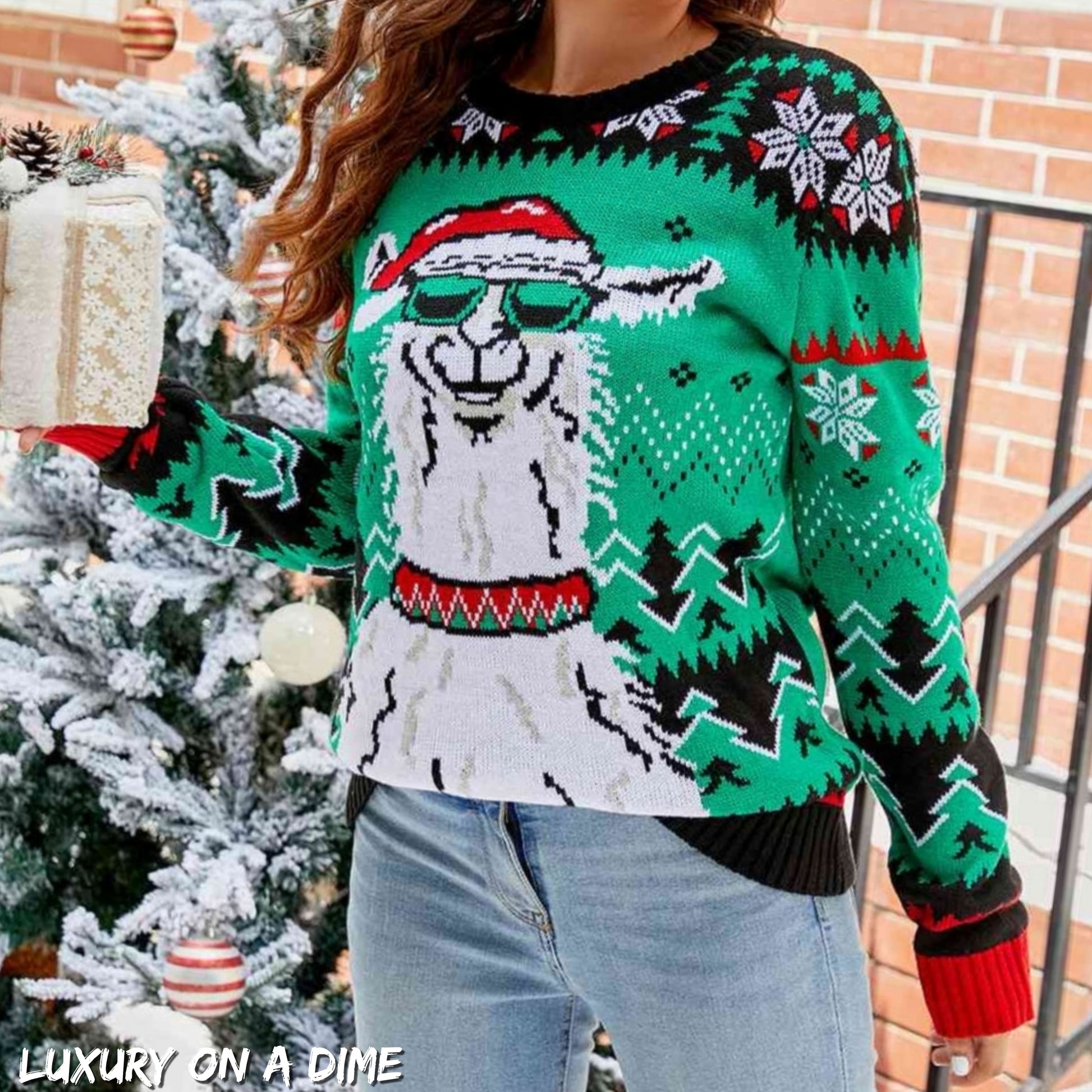 Llama Santa Festive Knit Print Round Neck Long Sleeve Holiday Sweater