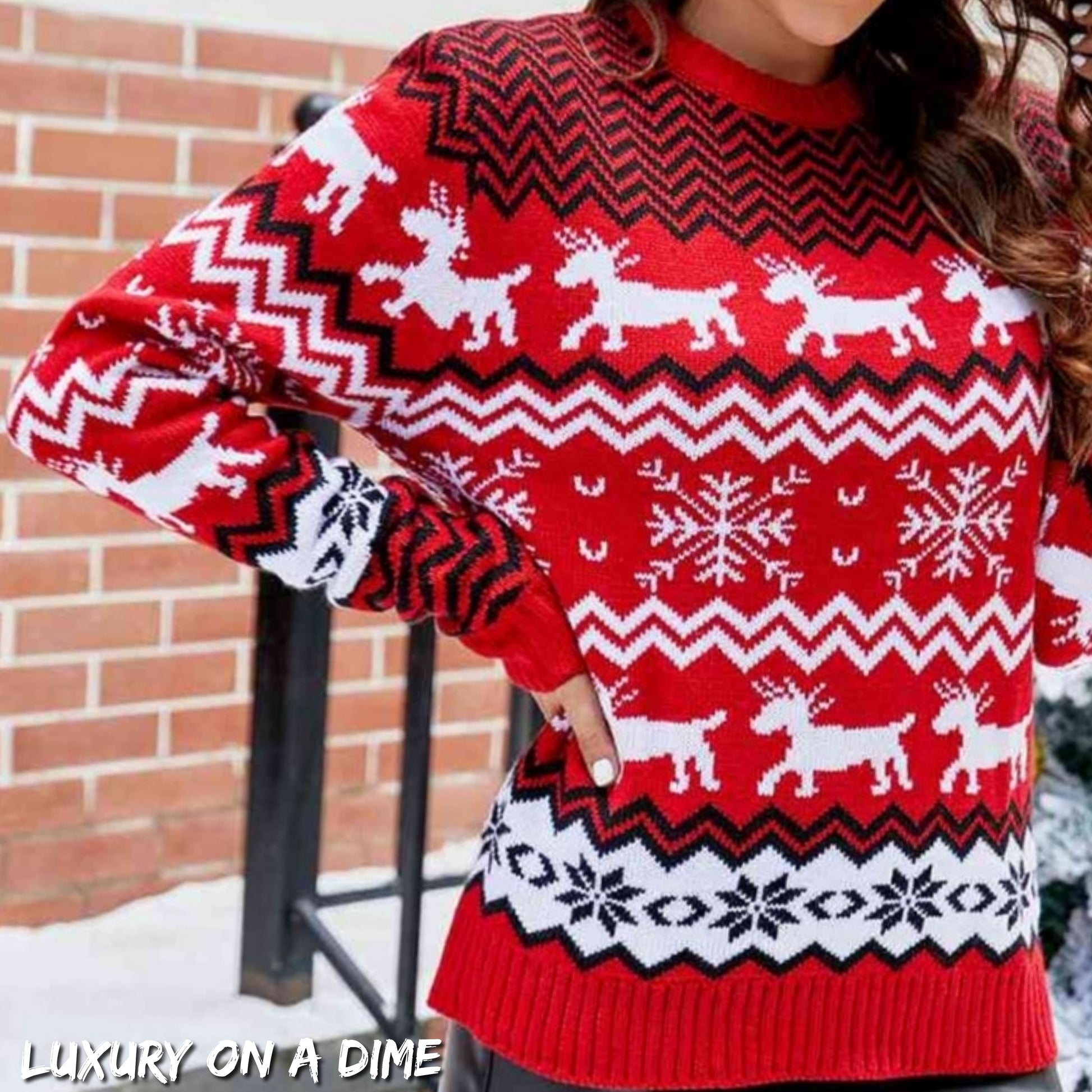 Knit Reindeer Snowflake Round Neck Winter Holiday Classic Long Sleeve Sweater