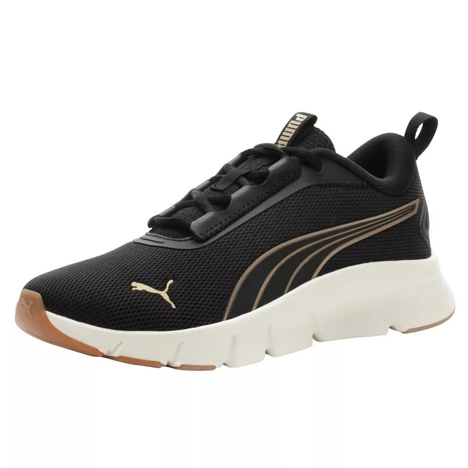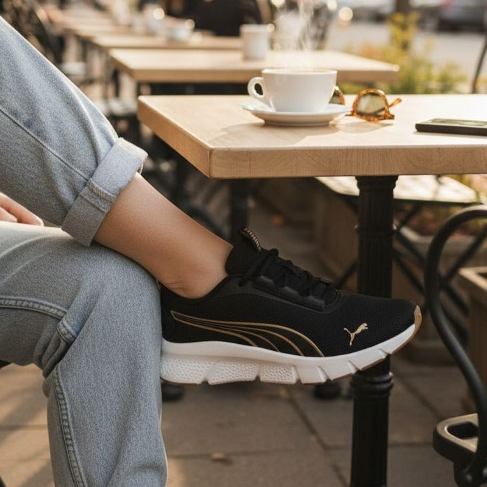 Meet your new everyday sporty sneaker. Lightweight, supportive, and styled with a quiet edge, the Focus Flex Lite balances performance with all-day ease. The breathable mesh upper offers a barely-there feel, while the cushioned insole and soft lining keep you comfortable from morning errands to evening strolls. A sleek lace-up design with metallic gold PUMA accents adds just the right contrast against the black base. The sculpted outsole is both flexible and grippy, ready for gym floors or concrete streets. This pair fits effortlessly into athleisure wardrobes, especially those leaning into normcore or off-duty model aesthetics. Comfortable enough for walking and stylish enough for brunch.