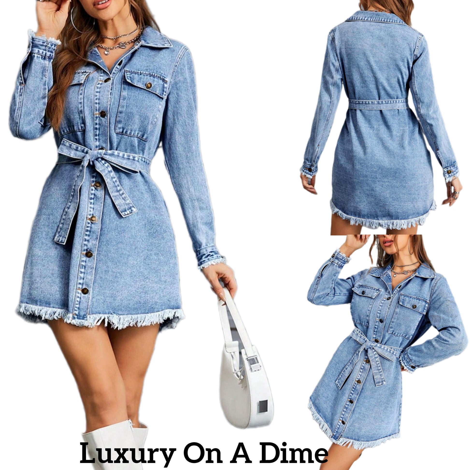 Belted Button-up Jacket Dress Denim Raw Fringe Hem Chest Pocket Jean Collar Mini