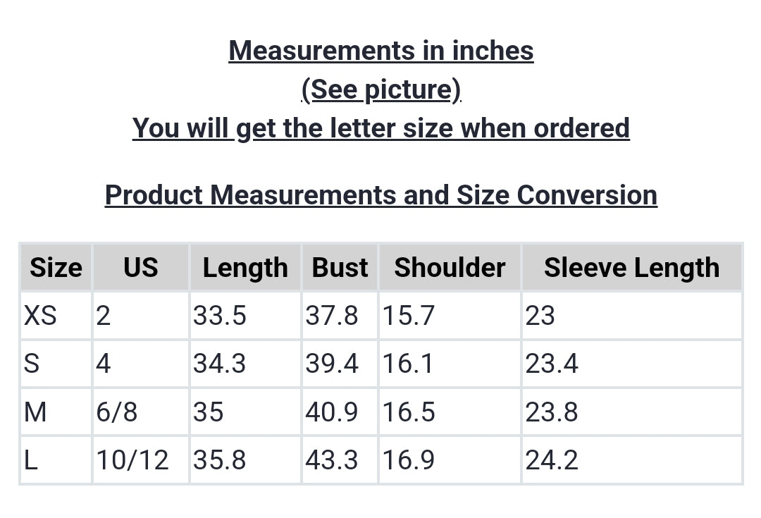 | Size | US | Length | Bust | Shoulder | Sleeve Length |