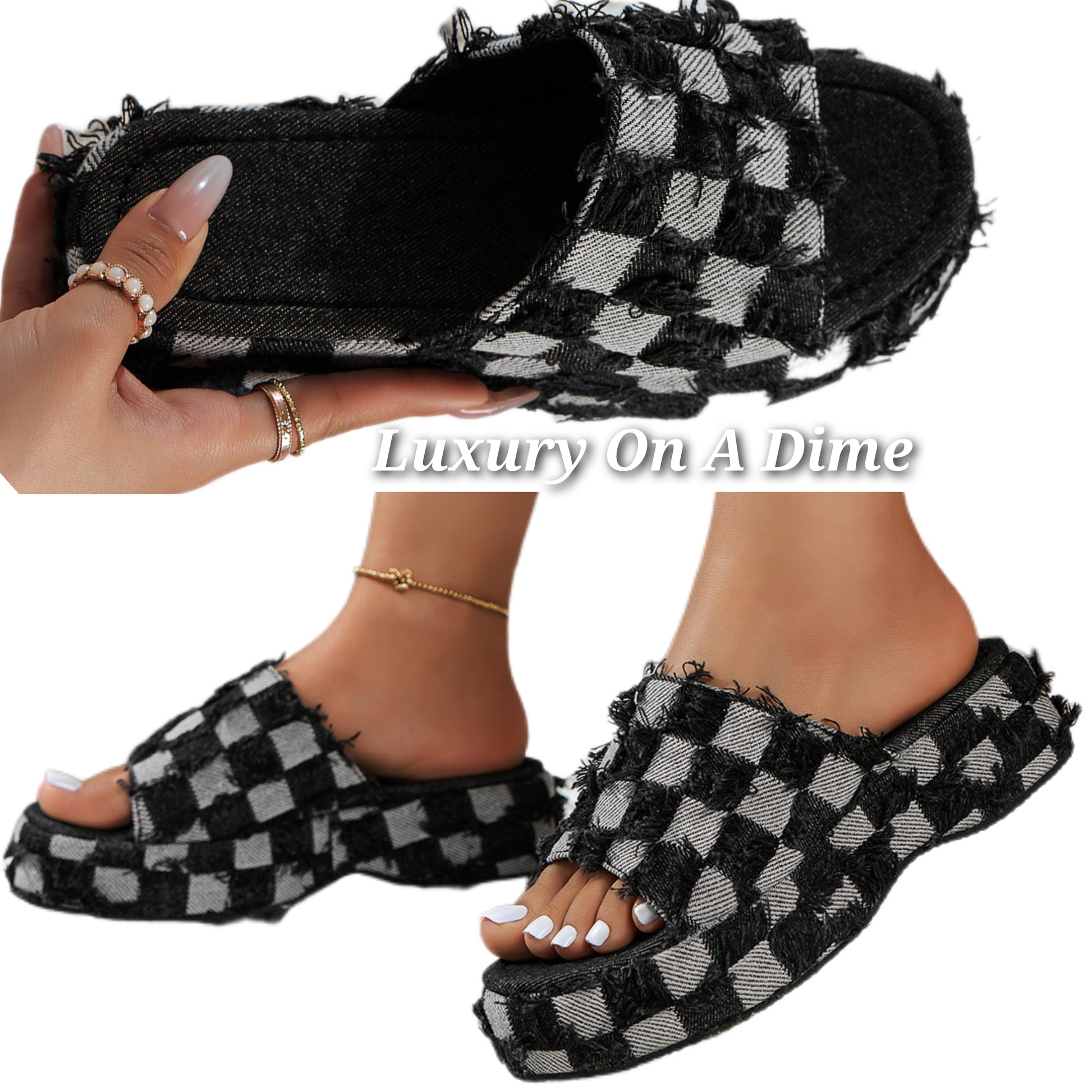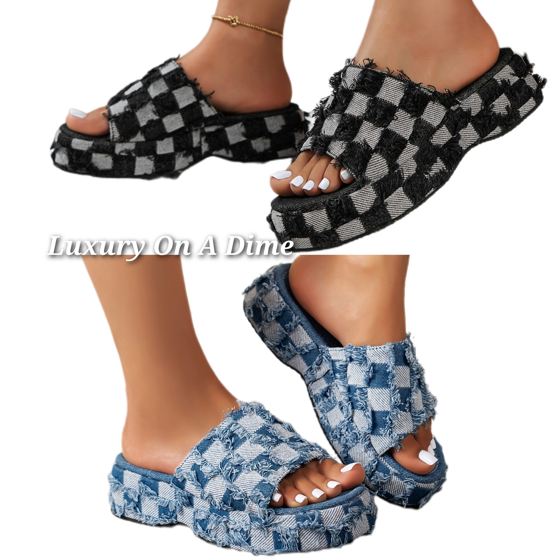 Frayed Denim Platform Sandals Distressed Checker Fringe Slip-on Boho Open-toe Grunge
