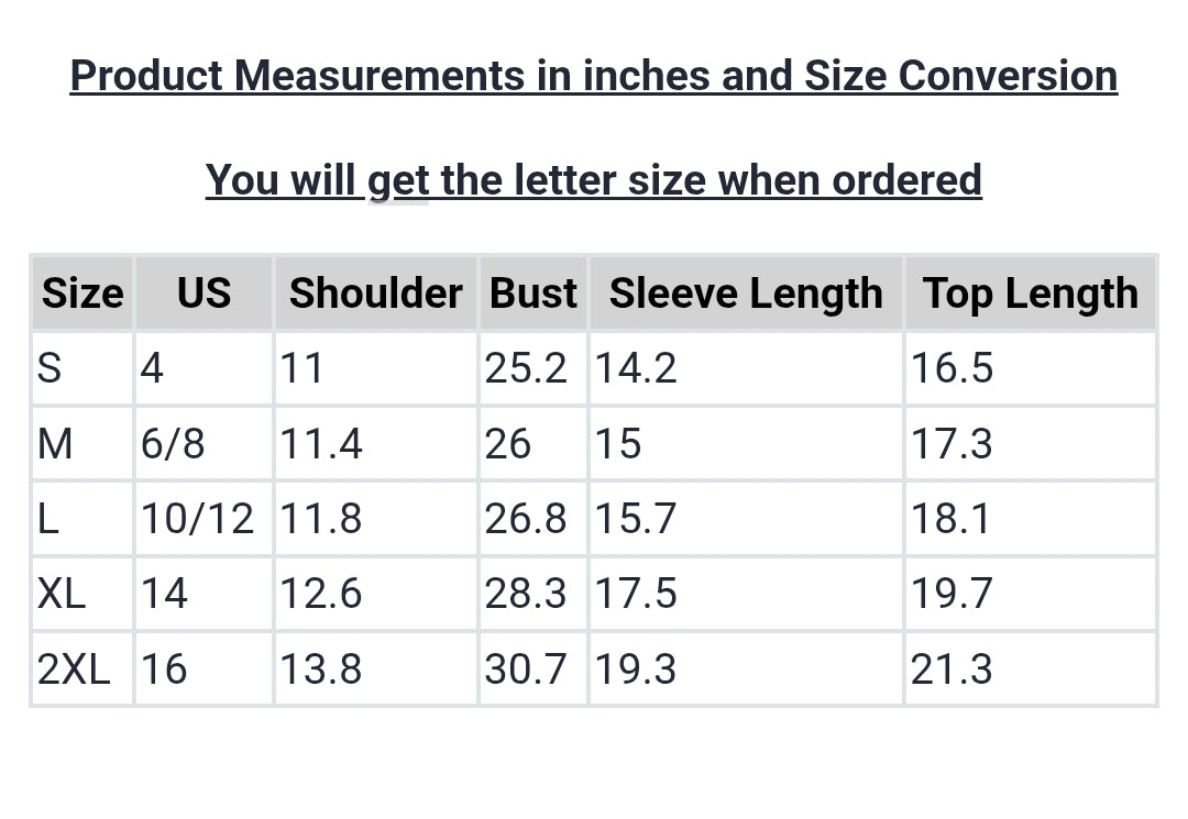 | Size | US | Shoulder | Bust | Sleeve Length | Top Length |