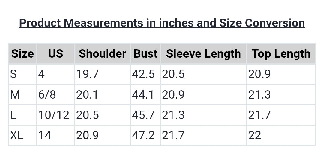 | Size | US | Shoulder | Bust | Sleeve Length | Top Length |